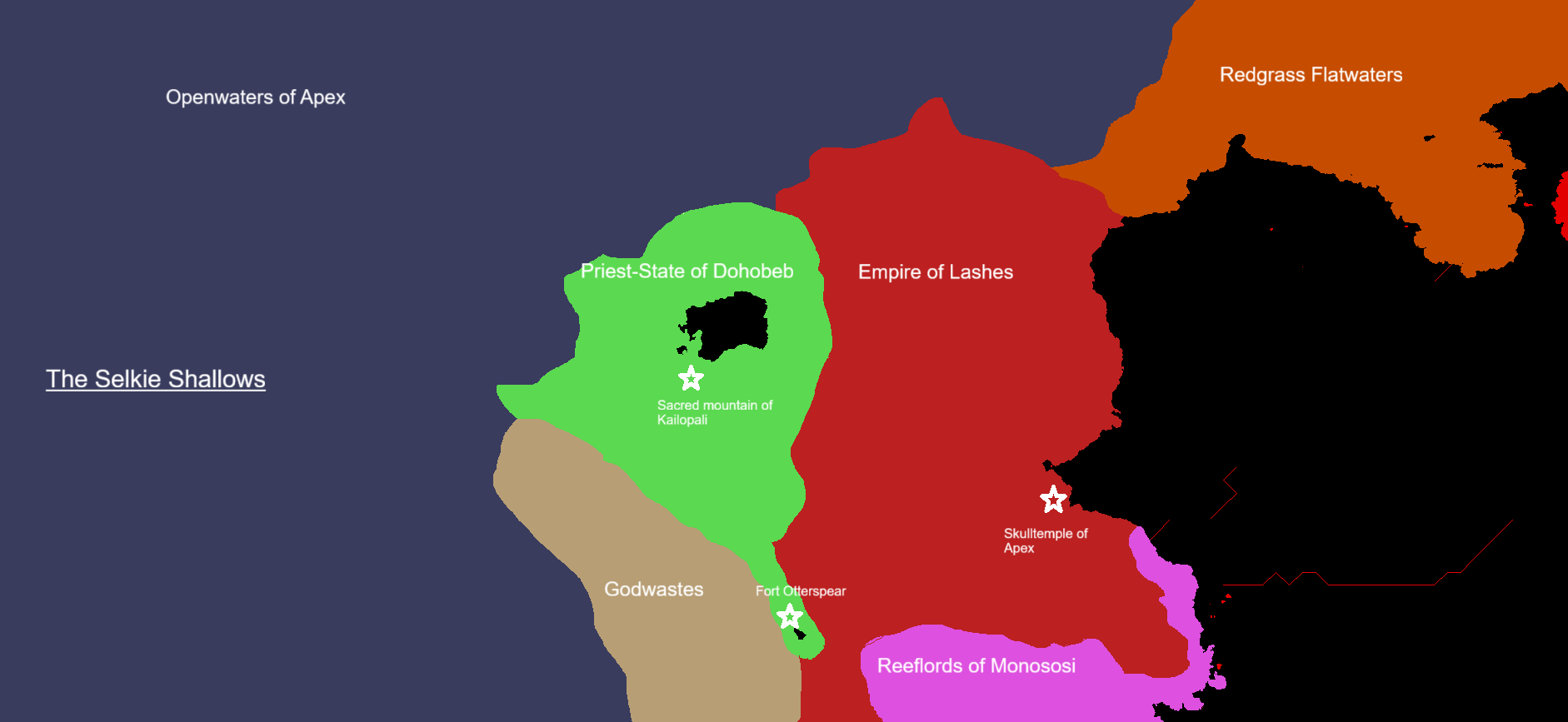 The Dohobeb Priest-State is the political organization built to enforce that Dohobeb worldview in the Selkie Shallows. The priests control the underwater territory immediately around the Khilaian Isles and are based in Kailio's sacred underwater mountain of Kailopali. The priests see the religion and government as indistinguishable; Kailio is their leader and their God and his will is their will. Practically speaking though, the Great Otter is not making policy decisions. Kailio is a sleepy demigod-kaiju with great power and a very narrow focus on responding to threats, and he has no desire to set taxation policies or make infrastructure decisions. He can be convinced to weigh in on issues with bribes of food and entertainment, but he considers himself to be a protector rather than a ruler.