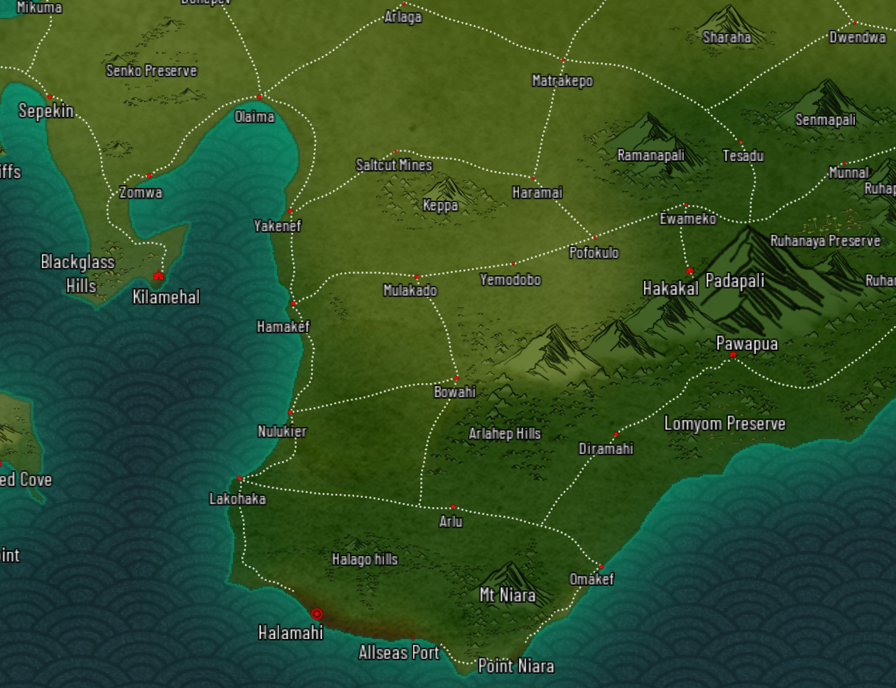 The Forbidden District: The Forbidden District is the part of Hakakal reserved for the Hanahai. This is a mix between libraries, archives, ritual spaces, military garrison grounds, and training grounds for promoted Hanahai. The Threadbearers, Keepers of the Dead, and Selkie Sacred Guard all have a substantial presence here. Non-Hanahai are forbidden entirely. This district contains the start of the Hanahai-reserved path around the caldera to Pawapua.