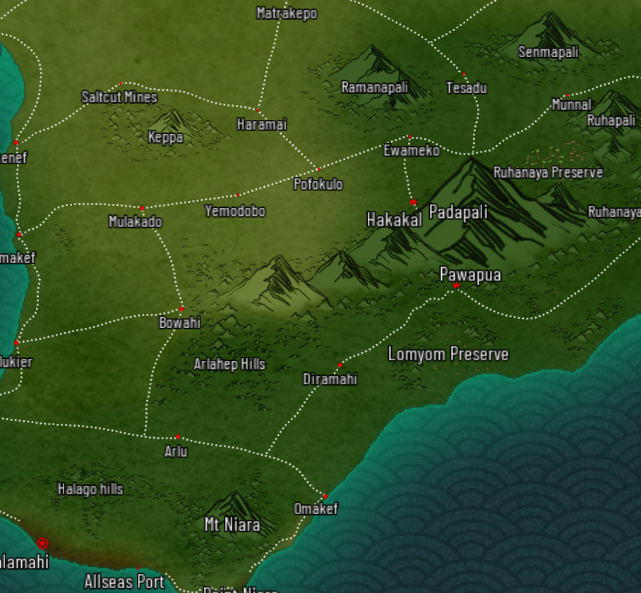 Padapali is traditionally a place of pilgrimmage, hermitage, and meditation used in some of the oldest ceremonies recorded in selkie history. Before The Chimera blessed Mohomwa Cove, this was the single most sacred place in the Khilaian isles. While the island of Okailu is now considered the more sacred place, Padapali remains a central point of training, administration, and ritual among the Hanahai sacred bureaucrats. The mountain is enchanted in its way, as this is where ancient Ghosts roam freely. Given the mystery and foreboding built up around Padapali, Gluttonmaws spawn here occasionally as well.