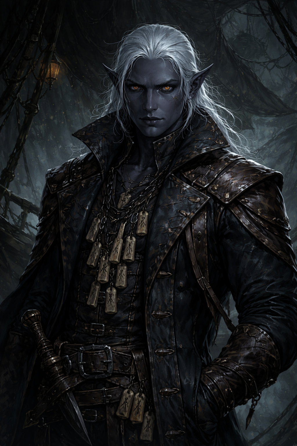 “Crowell” is a name he took, not inherited—claimed after the first captain who betrayed him learned what it meant to underestimate a drow who understands contracts better than loyalty. The second betrayal earned him the title Double-Crossed, a warning masquerading as a joke.