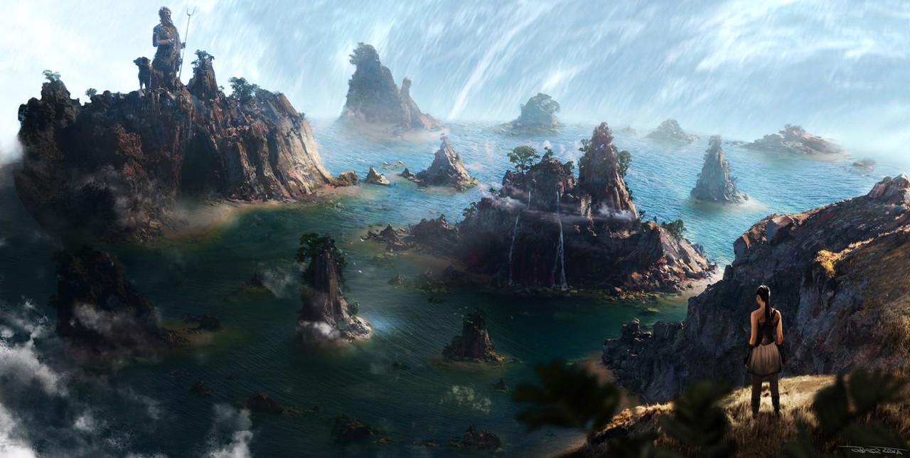 El vasto Mar de las Sirenas se extiende al oeste desde las tierras conocidas de Theros hasta los confines del mundo. Como dominio de Thassa, el mar esconde una asombrosa variedad de criaturas, incluyendo a toda la civilización tritón. Sus legendarios peligros abarcan desde arrecifes mortales e islas errantes hasta bestias depredadoras y krakens devastadores (véase el capítulo 6). En constante evolución, el Mar de las Sirenas es un reino de visiones imposibles y peligro constante, escenario de odiseas legendarias y la cuna de héroes.