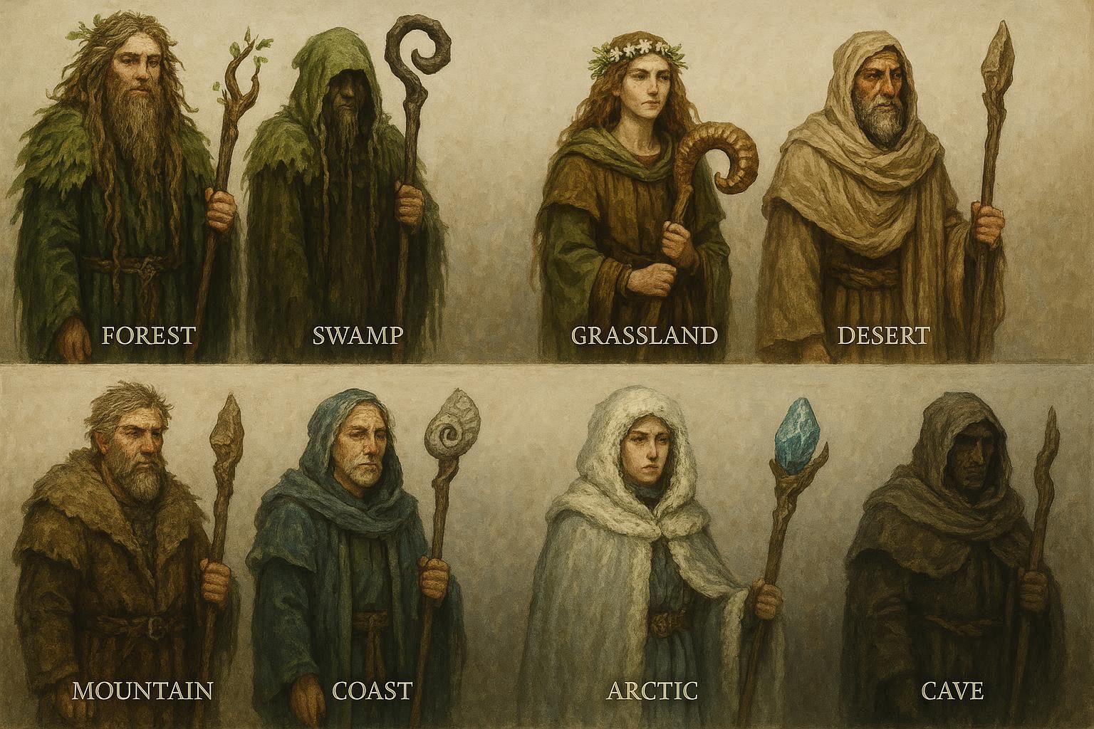 Druids were primal spellcasters of considerable power and versatility, who gained their power through being at one with nature or through a connection to a powerful deity or nature spirit. Guardians of the wilderness, druids saw themselves less as masters of the natural order and more as an extension of its will.
