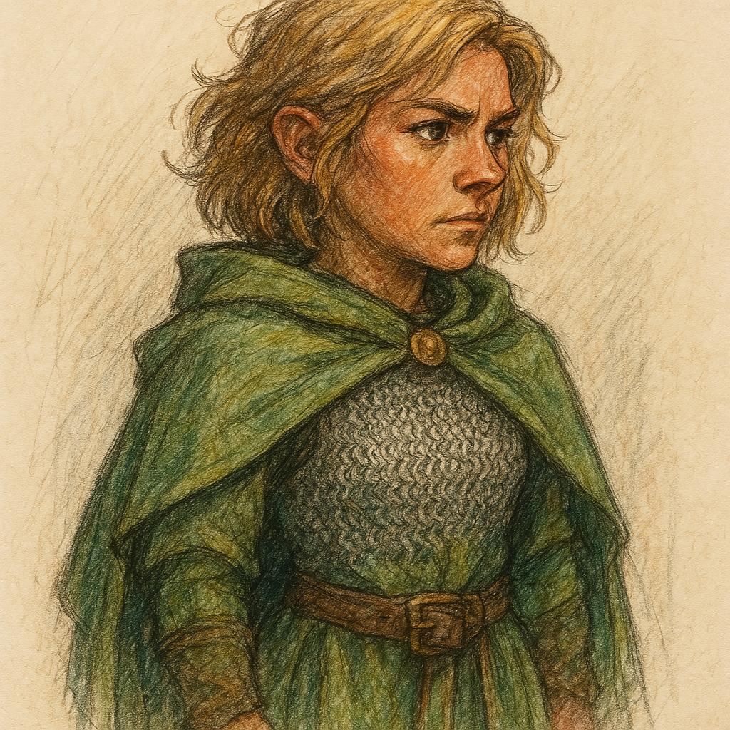 Description: She is a small woman, but exceptionally fit. She wears a fine chain shirt which she covers with green colored cloaks and clothing. Her brown hair has been sun bleached extensively. Her fierce brown eyes like to dwell on things.