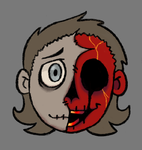 Although the left side of his face is normal, most of the right side of Haste's face is exposed skull, bearing a permanent grin and hollowed eyes. He sports a bright yellow crack running through his left eye, down to his cheek.