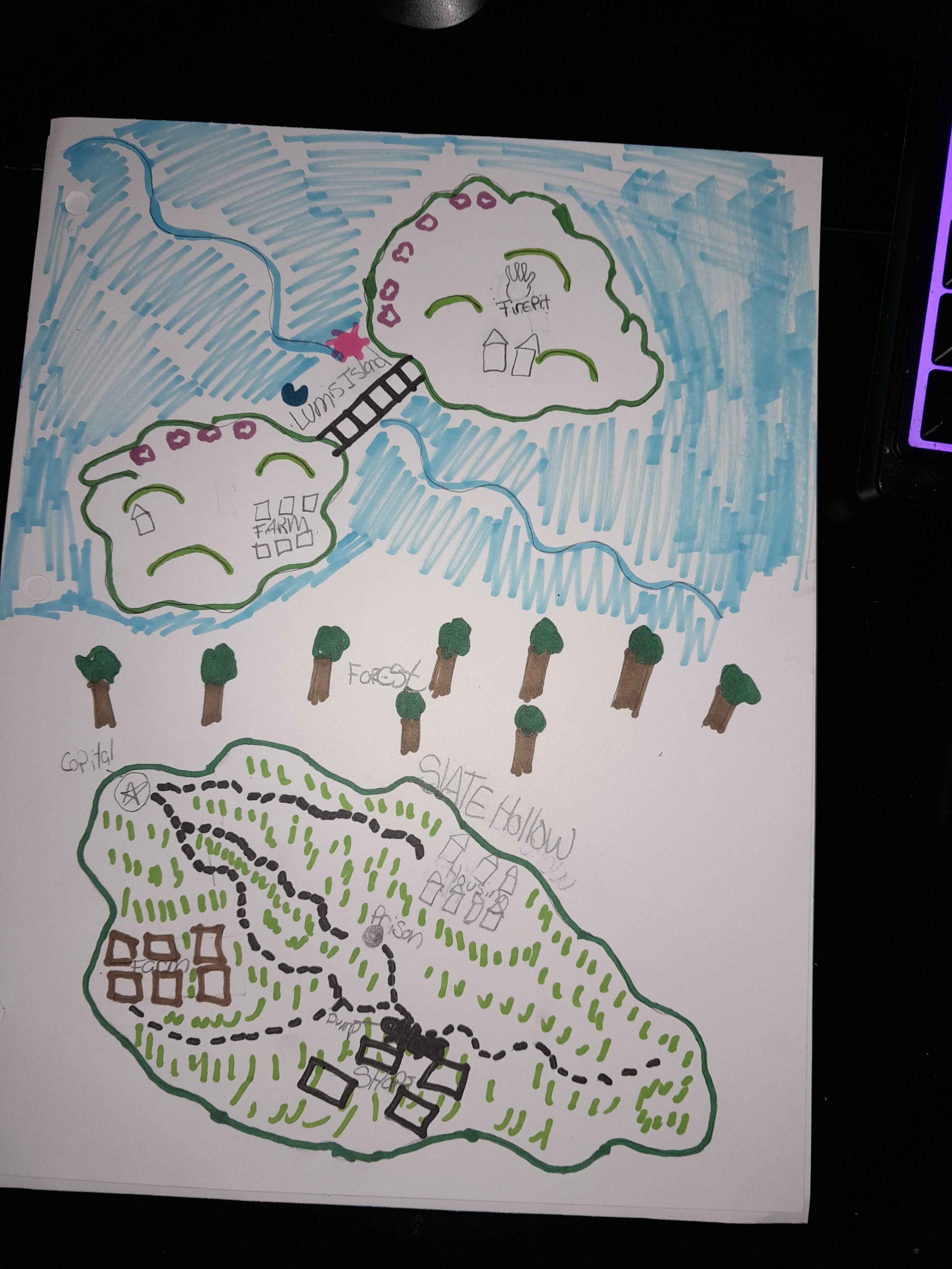 The terrain of Slate Hollow is in a forest that has been cleared for them to build. The trees are tall and a dark oak. The access of things for the people who live there are water, food and clothing stores.
