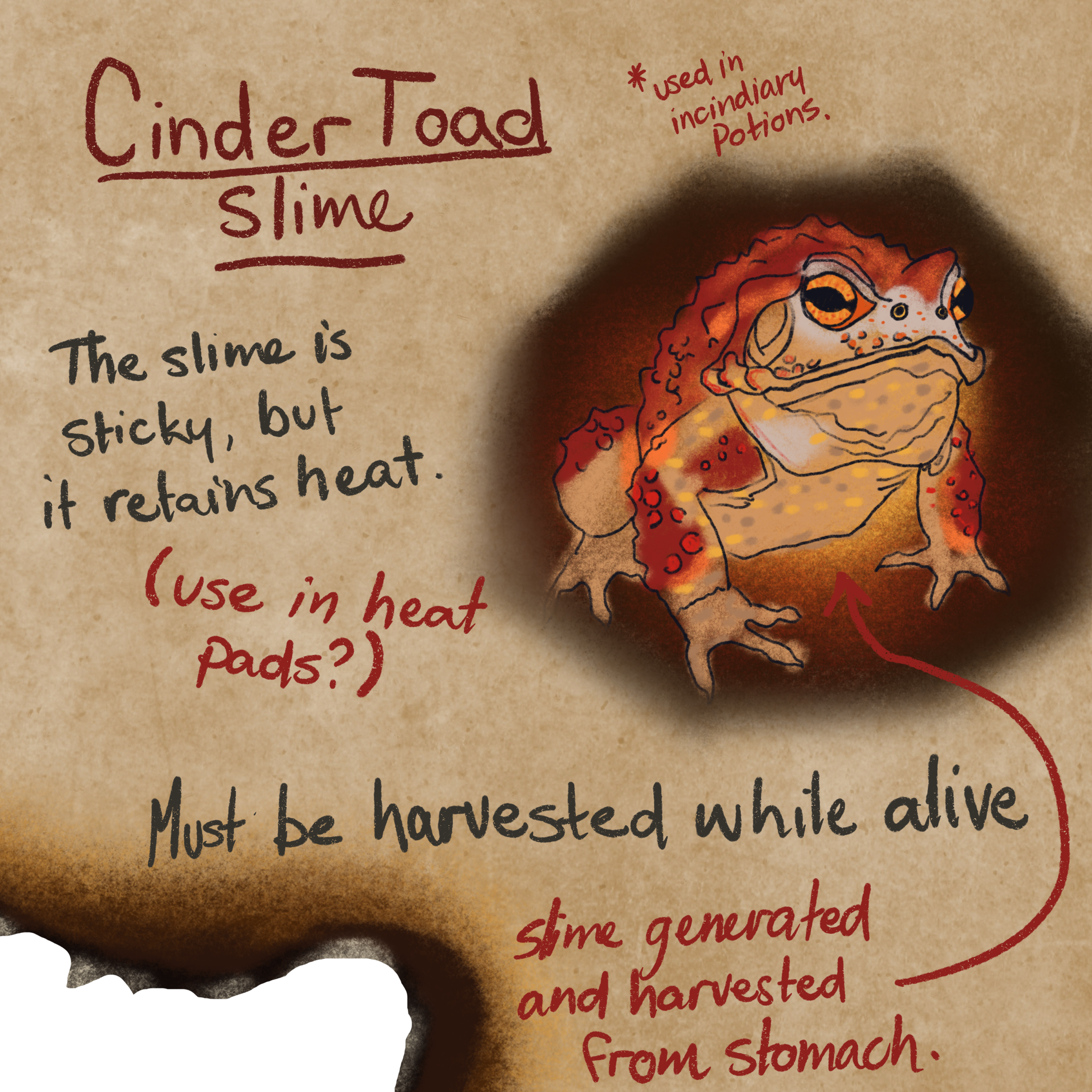 Cinder toad slime is the viscous secretion that is produced by Cinder Toads who can often be found in volcanic marshes and jungles in the south. Unlike regular toad slime, this mucus is able to retain heat. This makes it perfect for potions and things that need a pinch of heat to it, in the literal sense. It is a translucent amber with crimson streaks marbled through it.Properties