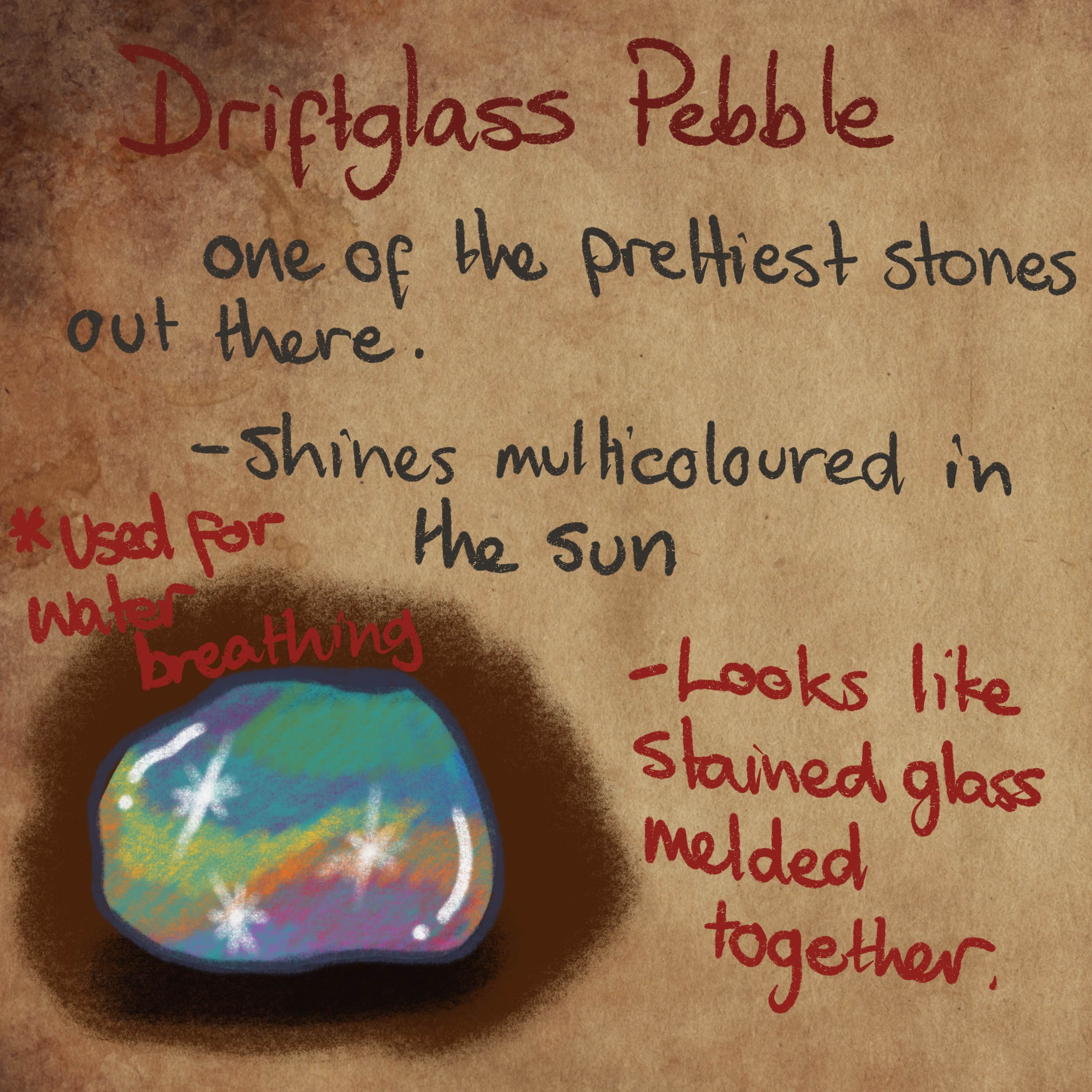 Driftglass Pebbles are lighter than regular glass, stronger than it and, usually move around with the tides. Larger chunks have a harder time rolling with the whims of the tides. While fully submerged, the Pebbles allow the bearer to breathe underwater. It must be held against bare skin. It encourages gills to grow temporarily which makes you able to breathe. Additional properties include better underwater vision, bioluminescence and water manipulation.