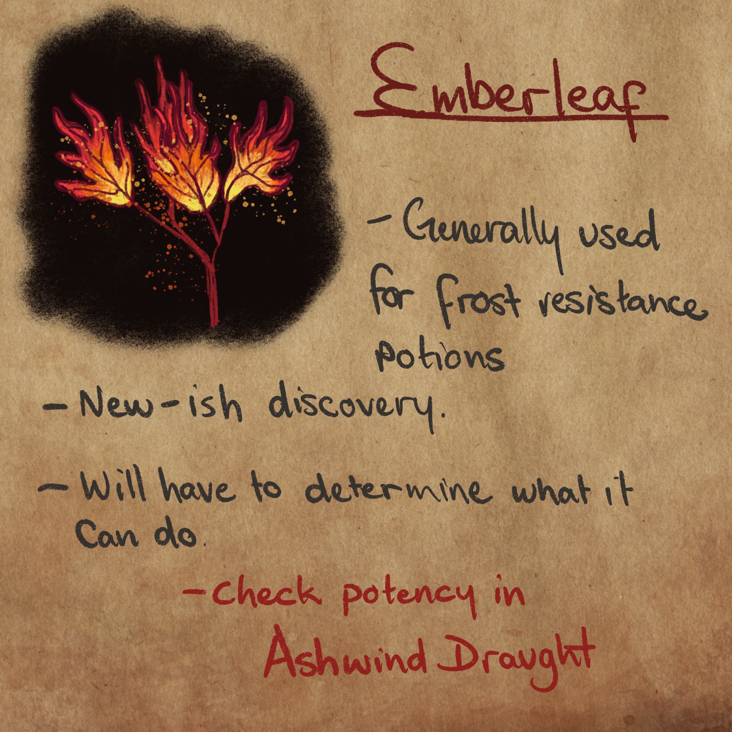 Seeing as how this plant has recently surfaced, not much is known about it. The plant itself is warm to the touch and pleasant to handle. Seems to be able to provide cold-resistance if made into a potion, and if made into a blade oil provides the ability to burn things. When burned Emberleaf can provide a boost of courage and vigor or clarity in spellcasting and battle depending on the circumstances.
