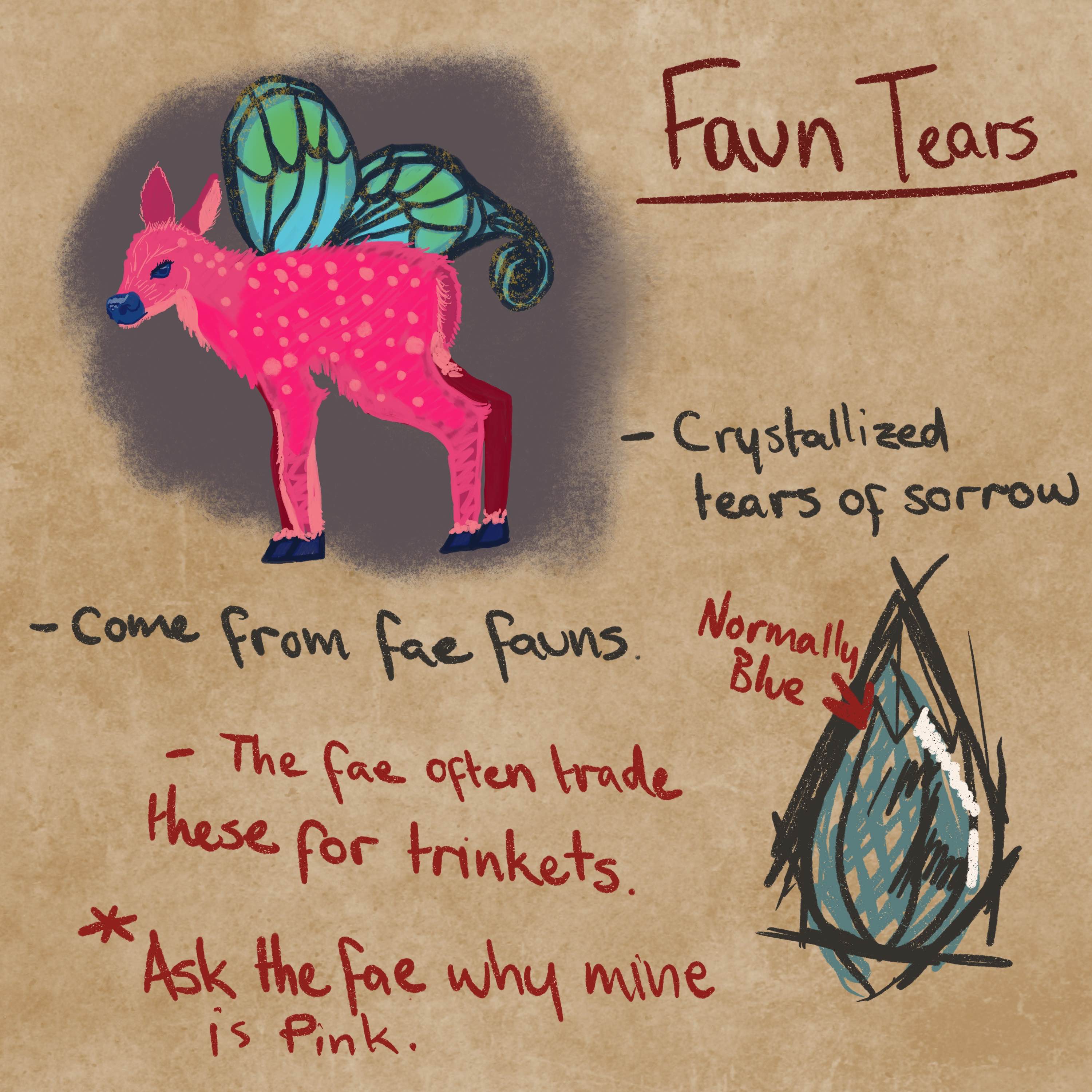 Faun Tears manifest as small crystallized droplets that come in different colours depending on the mood you imbue them with. Wearing one of these droplets can amplify emotions. Adding crushed ones to potions revolving around memory causes the user to feel the emotions they felt in that memory.