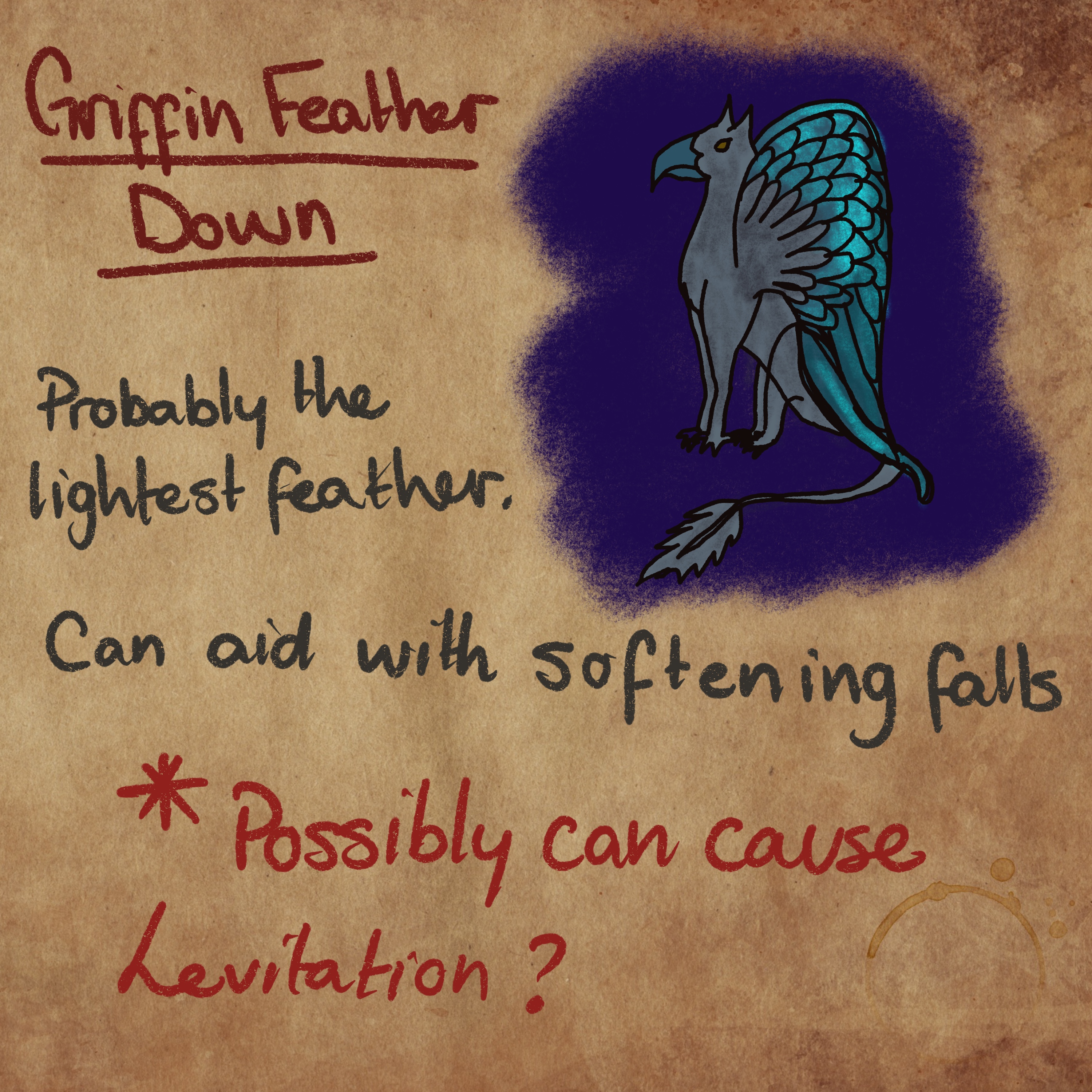 Typically and ideally, you'll want to gather these from the abandoned nests after the Storm season. You only have a window of about 2-4 weeks to obtain these feathers before the abandoned homes of the Griffins become claimed again. If one does happen to catch you, bow before it and show you mean no harm. Take only what you need. After gathering, keep in a stone lined bronze box for safe keeping. To prepare for potions, it has to lay on cold moonstone for several days, or at least until the innate static electricity within the feather quiets down to an acceptable and handleable state.