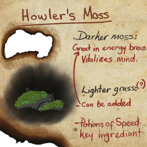 Howler's Moss is attuned with air magic and crackles with energy when you run your hand across it or a thunderstorm is rolling in. It is rather painful to be shocked by this moss, and therefore must be handled with care. The darker moss can be brewed into a coffee substitute, in a pinch. The lighter moss is generally harder to grab, if you're too slow for it. Generally it has an affect on ones speed, mental or otherwise...As An Alchemy Ingredient
