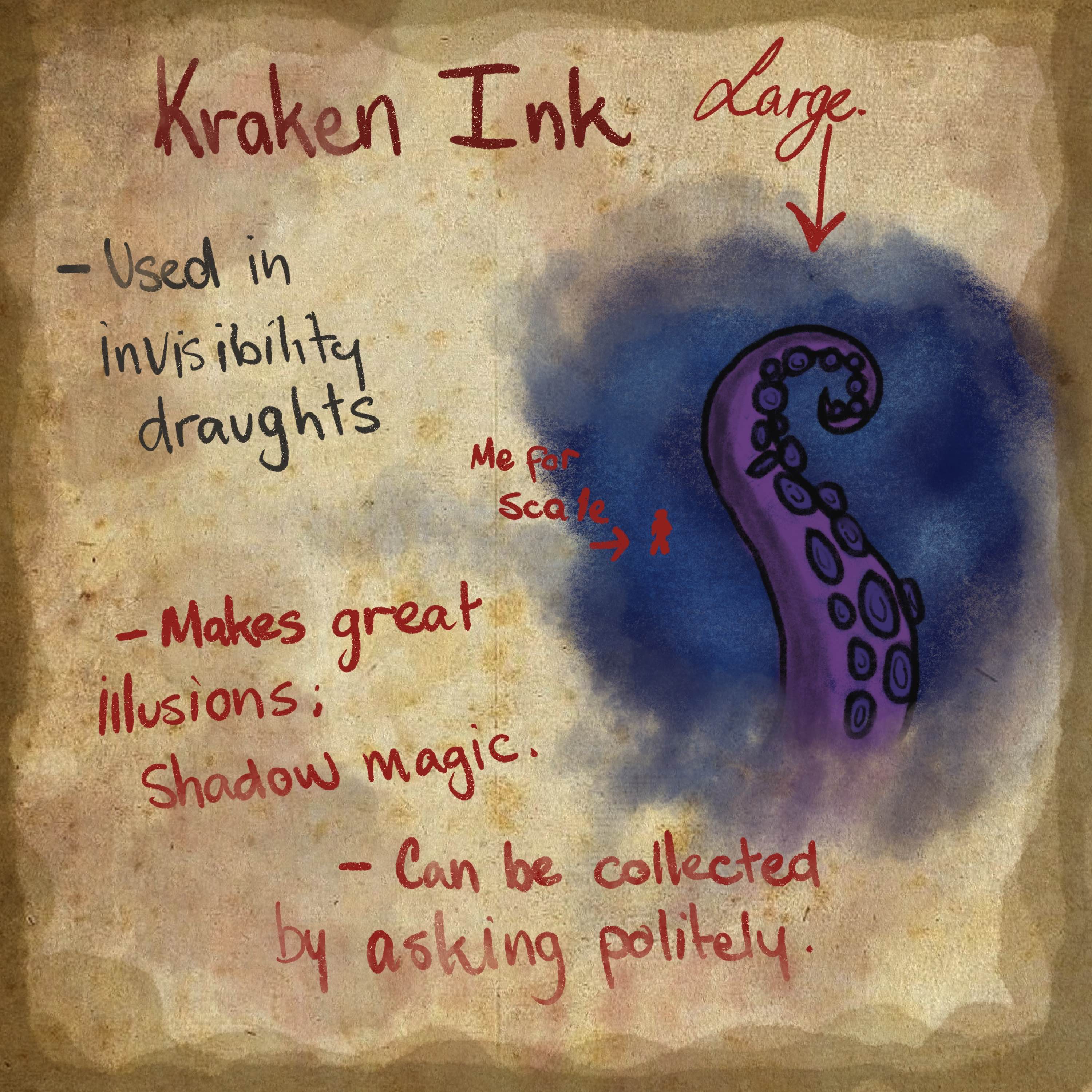 Kraken Ink is used for illusion and shadow magicks and is often used and prized by many diplomats and spies. The ink is invisible when dry and only able to be seen with a specific spell and passphrase. The passphrase is determined by the alchemist who makes the ink itself. There is also bits of umbric residue within the ink and Umbramancers are able to make the residue solidify and meld to their wills.