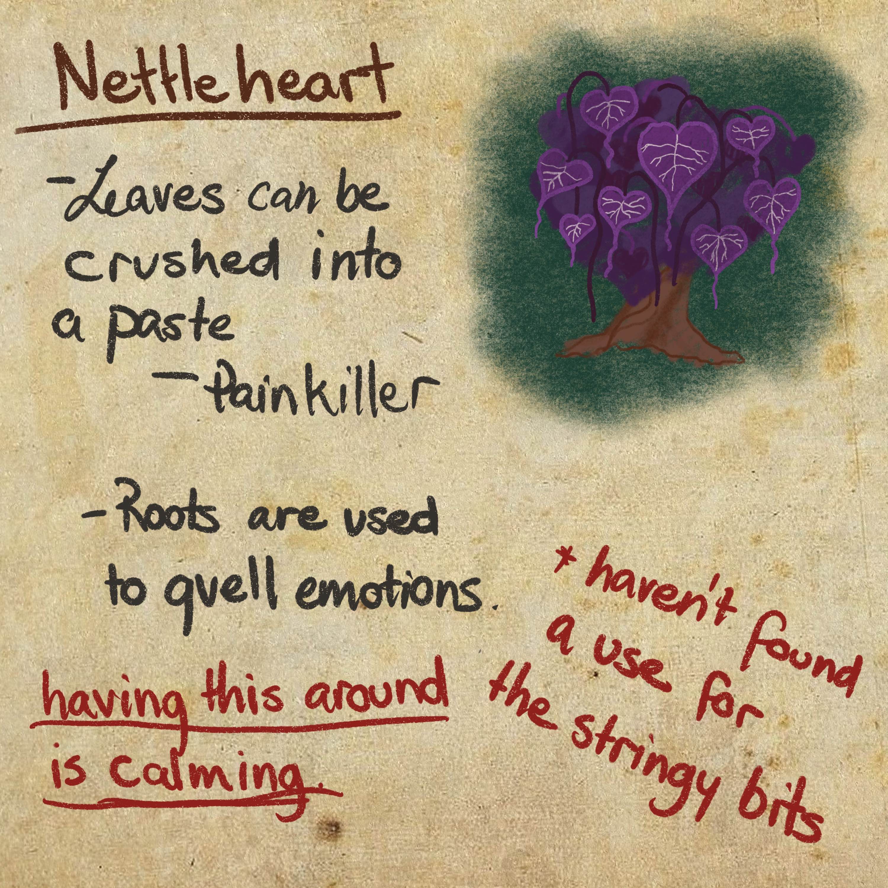 This shrub's range is from the lowlands of Granemire and the hollows of the Blackfen Marshes. This particular plant prefers stagnant waters where it can drink to its heart's content and its roots can spread deeply in the silt. It is often said amongst the locals of those regions that wherever the Nettleheart grows, spirits of sorrow often linger there. Nettleheart is a small shrub that barely ever grows past a person's knee. It has dark purple, heart shaped and serrated leaves that sting when touched without gloves. There are silvery veins that run along the top of the leaves that pulse slightly in the moonlight.
