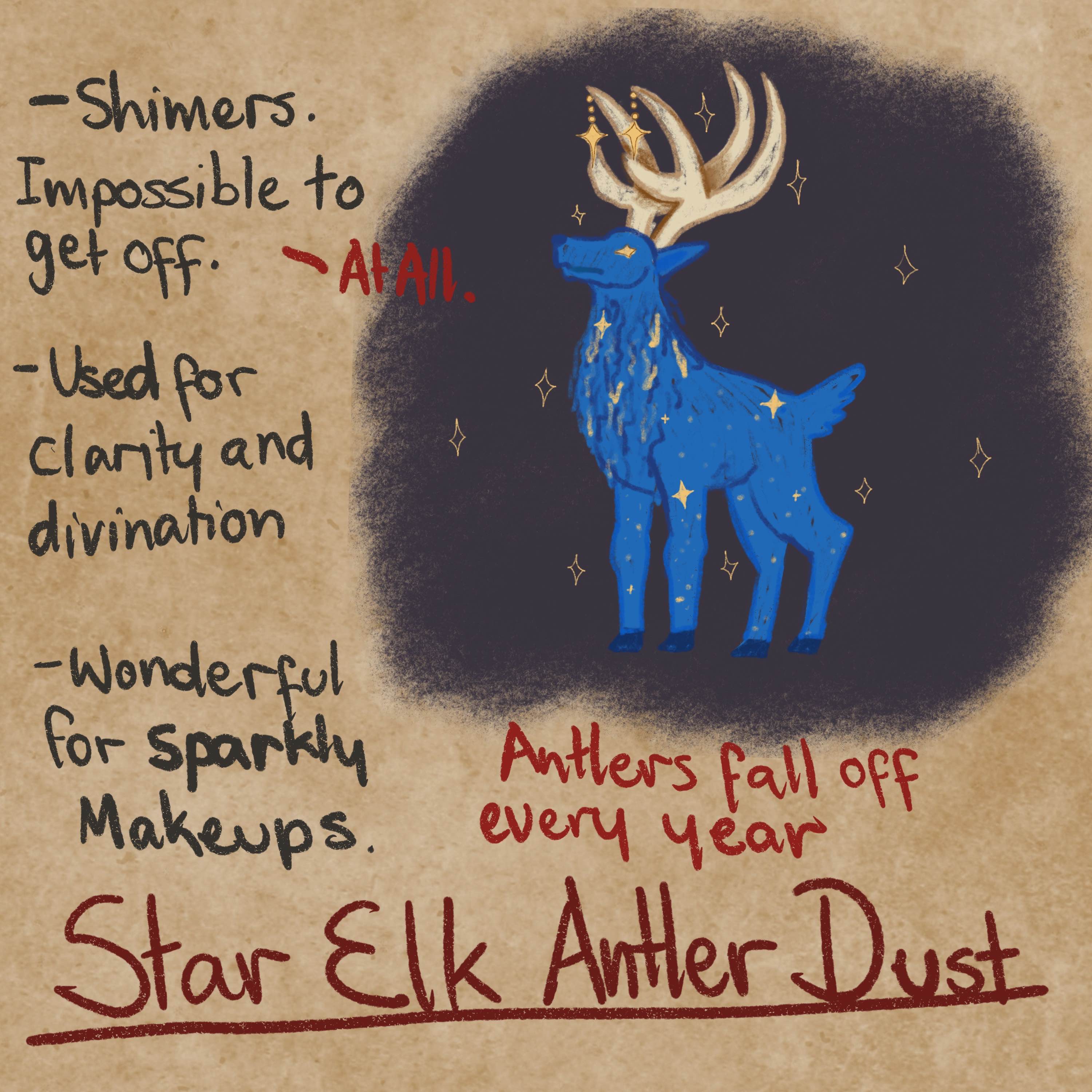 NEVER - and I mean never - take these directly from the animal itself. Not only are they protected, they are unusable if they are taken directly off of a Star Elk. The innate magicks of the antlers turns sour and they have the potential to cause violent hallucinations and paranoia. If you do happen to find some, ensure you offer something for the spirit of the elk. Things such as a song, foods, or a small token are enough to please the spirit and you should be able to pick them up with no issues. As far as preparations, sanding the antler and grinding chunks of it into super fine powder is usually all it takes.