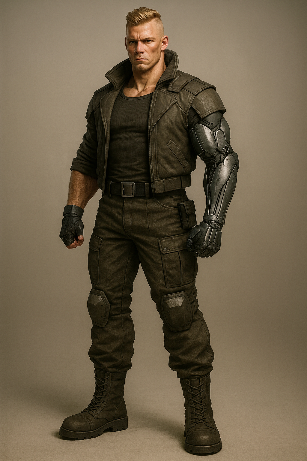 His hair is ash blonde and cropped close, with shaved-down sides and a forward-brushed top that refuses to stay neat—always halfway between regulation and rebellion. His skin tone is bronze-tan, roughened by sun exposure, scorch residue, and a lifetime spent in blast zones and dockyards. There’s no visible cosmetic work or vanity-enhancing mods—just a few calloused scars along his knuckles and jaw, the kind earned from hitting things harder than they should’ve been. He doesn’t posture. He doesn’t pose. When he stands, it’s like the ground should be grateful he didn’t come crashing through it.