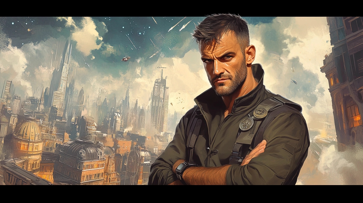 His skin is sun-bronzed, weathered by years on too many frontier worlds. His eyes are a piercing grey-green, sharp and always searching, the kind of eyes that catalog every possible exit when he walks into a room. There’s an old scar across his left temple, just visible beneath close-cropped dark hair peppered with silver, a reminder from a mission he never talks about but clearly never forgot.