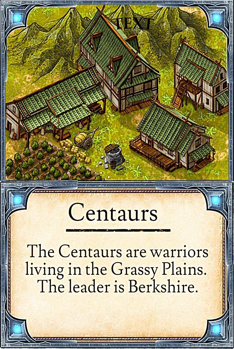 The Centaurs are warriors living in the Grassy Plains, after their kingdom, Calavera Castle, was taken over by House Bishop years ago. The Centaur is a peaceful warrior clan that has been on the Isle of the Forgotten for centuries. They are great masters of the staves, poles, swords, and shields, using them to protect themselves.
