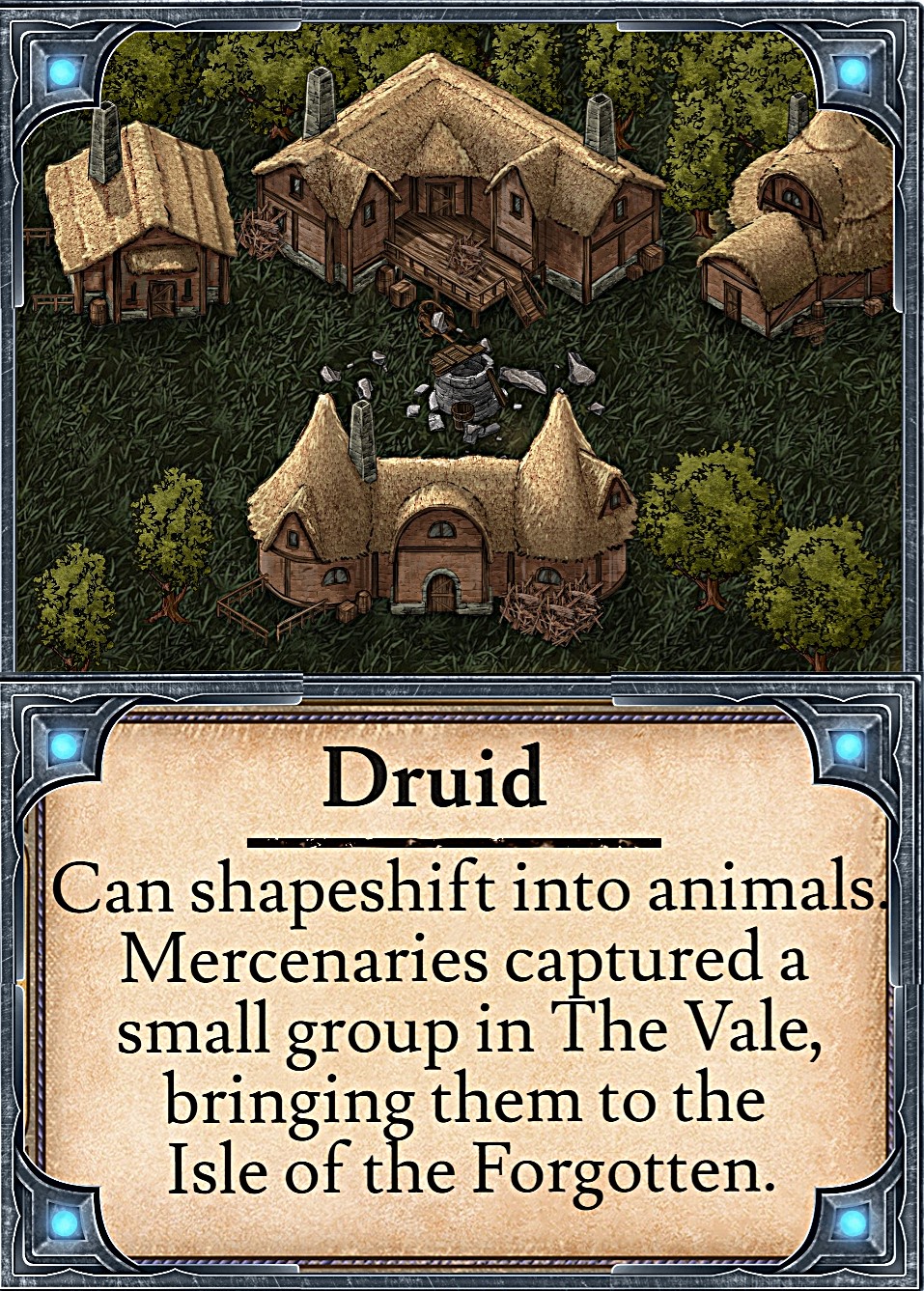 The druids fell prey to mercenaries who captured a small group of the in The Vale outside the druid city, Ravendell. There was no warning before the kidnapping, and by the time word reached the leaders, they had escaped. Ships were launched to search for the individuals, but they could not be located. They were brought to the island along with the Shaman and Dwarves.