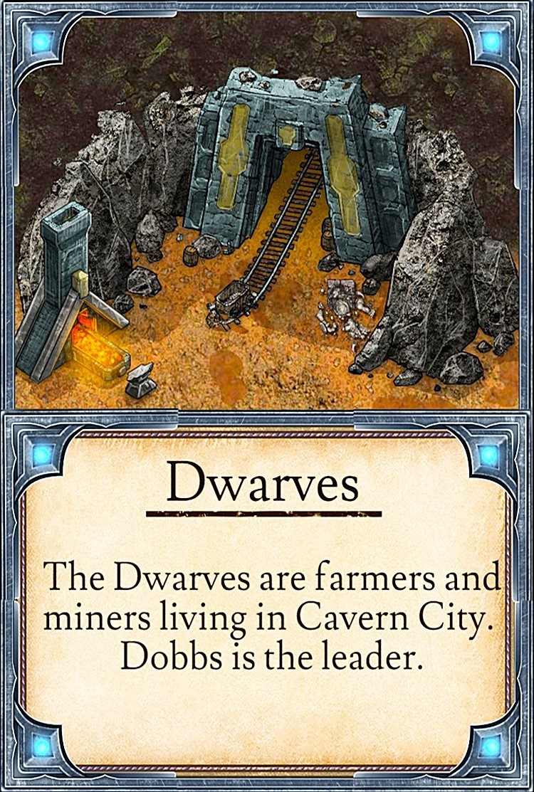 Dwarves came to the island along with the shaman and druids centuries ago, during a vast sweep by mercenaries to collect those who were rebelling against the realm. They settled in around the mine, which was close to the capital, Calavera Castle, as well as other resources, water sources, a mine, and trees.