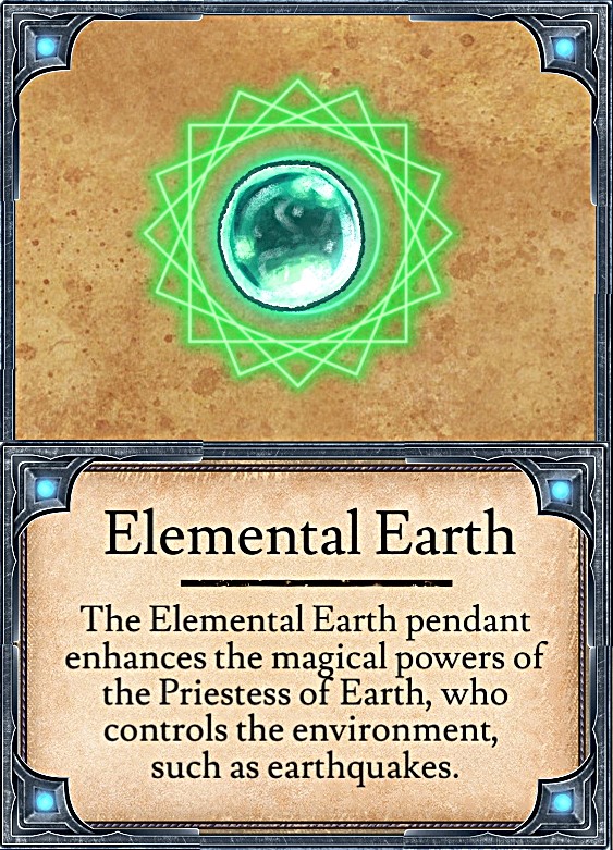 The Elemental Earth pendant enhances the magical powers of the Priestess of Earth, who controls the environment, such as earthquakes.