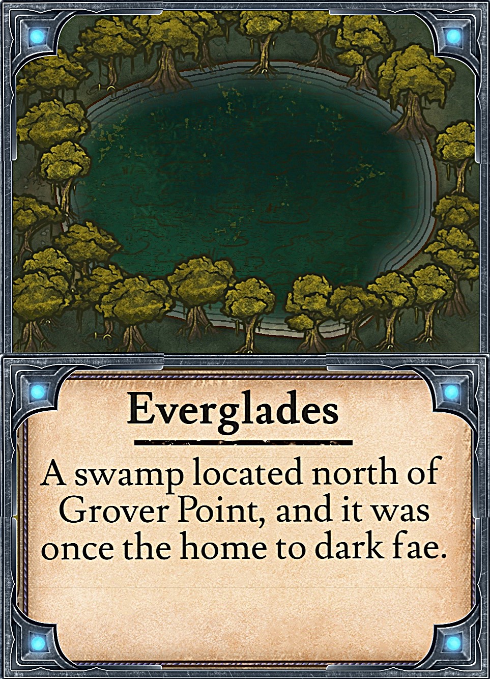 The Everglades is a swamp located north of Grover Point, and it was once the home to dark fae.