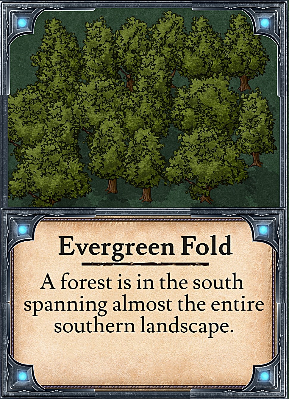 Evergreen Fold is a forest is in the south, spanning almost the entire southern landscape.