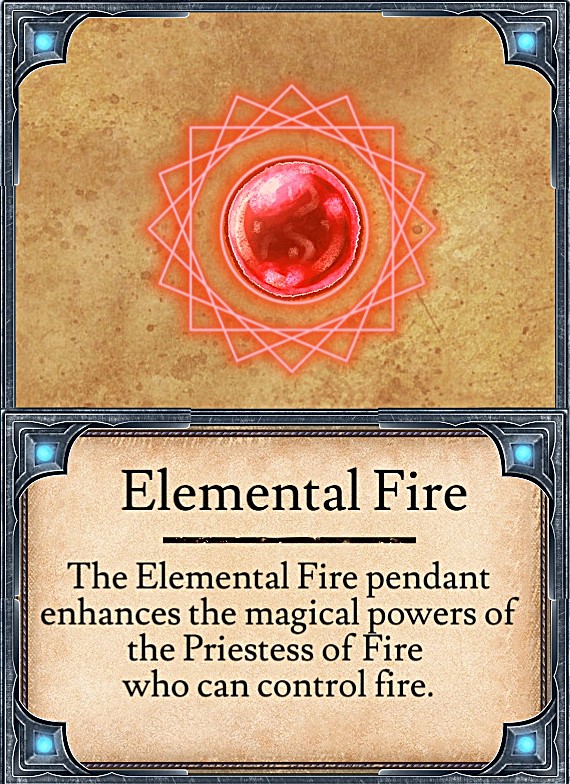 The Elemental Fire pendant improves the ability to enhance the magical powers of the Priestess of Fire, who can control the environment, such as fire.