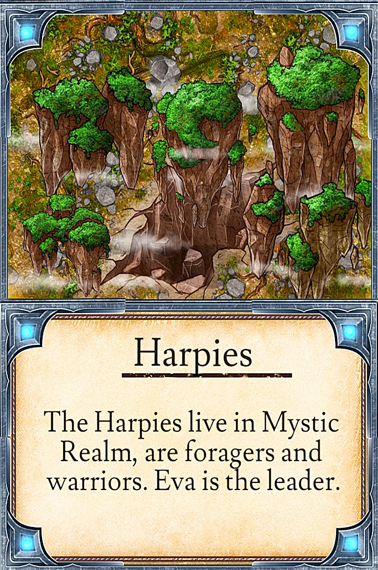 The harpies are more secluded in their own world and do not like to interact with other factions. Those who have been around a long time do miss their prior home in the forest, but the current generation enjoys the openness and mystery of the Mystic Realm.