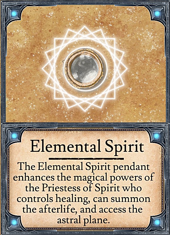 The Elemental Spirit pendant enhances the magical powers of the Priestess of Spirit who controls healing, can summon the afterlife, and access the astral plane.