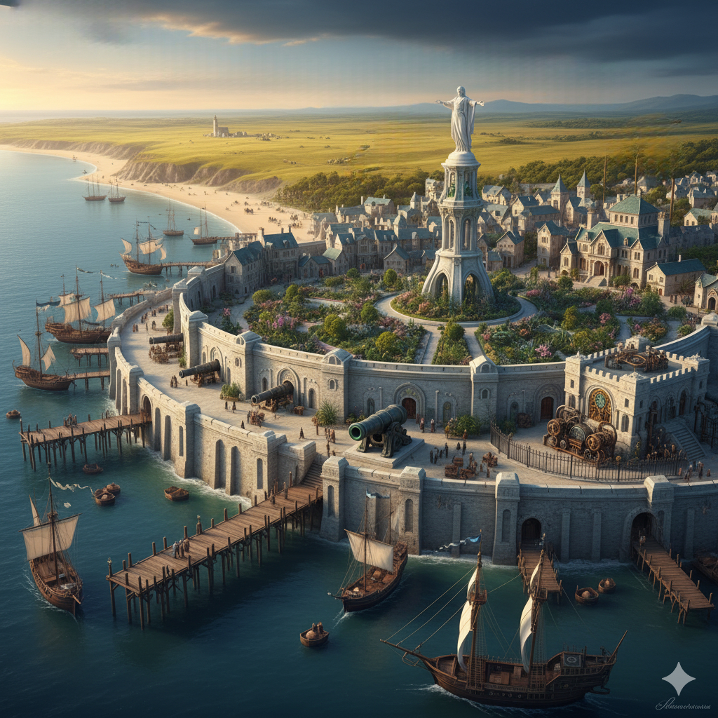 For the first half of the history of the Kingdom of Owenar, Crescent Port, the sea trading district within the capital, has stood as the center of all international trade for the kingdom. As House Alban rose from humble beginnings to one of the wealthiest families in Ixala, they sought to construct their port system outside the capital. Not necessarily to overarch the wealth of the merchants of Crescent Port, but to necessitate the stifling of their influence over trade in Westenra as a whole. Too much coin had been spent in one small area that the kingdom's economy had been focused solely on the capital, while the rest of the kingdom had to rely on bartering goods. Port-au-Belles was conceived by Edward Alban III to open a new trade route in the Southern Valley. A not-so-simple task, as it required the support of the Southern Valley Tribe, who saw the coastal part of the region as sacred to their horses. It would take decades of friendly relations with the tribe to convince the tribe to turn the coast into a thriving trade route. Its construction would be heralded as the most pristine town in the kingdom. Full of lavish gardens, innovative steam-machinery, artistic architecture, and a pristine port system. Hence why its name translates to "Port of Beauty."