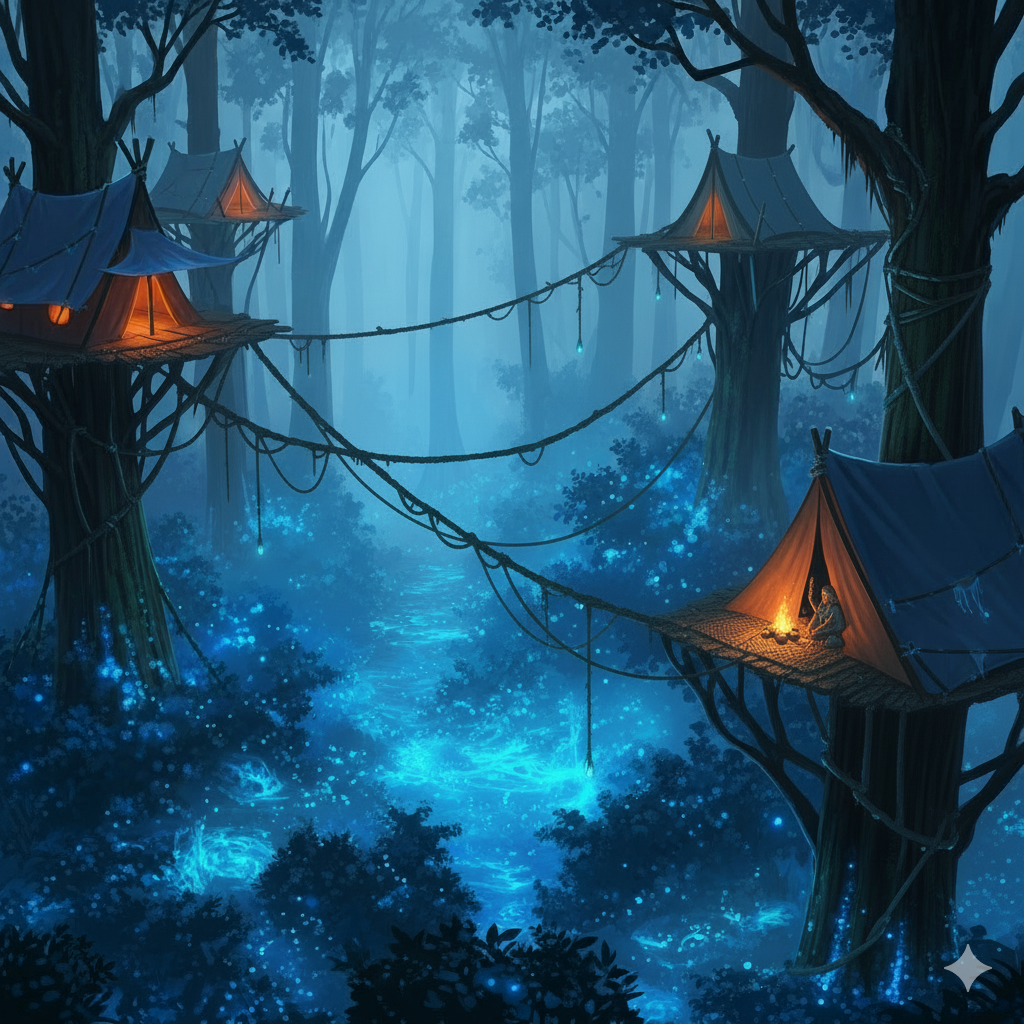 To protect the last of the sapphire dragons, the rangers hold a ceremonial title for those chosen to protect the dragons for life. Known as a Wyrm-Singer, they are selected through a ritual called the Wyrm-Singer's Ascent, a rite to a successful bond with one of the sapphire dragons. Where success is rare because the dragons are difficult to connect with socially. Additionally, every solstice, the tribes partake in a feast to honor the lifeblood of the forest, consuming food laced with sapphire algae to gain resistance to its toxins, often eliciting hallucinations and ecstasy. Day-to-day, rangers start their mornings by climbing to the highest point nearby to watch for activity, then, after a light breakfast, begin their assigned roles—gathering herbs, locating herds, tracking movements, hunting strays, crafting tools, surveying footpaths, and organizing camp. To make setting up and dismantling camp easier, they combine their unique tree-climbing skills with ropes made from vines, forming a pulley system that allows them to hang materials and fabrics for elevated tents on branches. Their diet consists of a form of bread and a variety of supplements added to it. The most common plant, spider grass, has a unique quality: it can be dried into spider wheat using an underground furnace. When mixed with herb-infused water, it forms dough, which is then baked into ranger bread—potent enough to feed a hungry man daily. To enhance flavor, rangers often add crushed oak berries made into jam. During successful hunts, nothing goes to waste—meat is dried into jerky, bones ground into powder to enrich soil, or crafted into basic tools.
