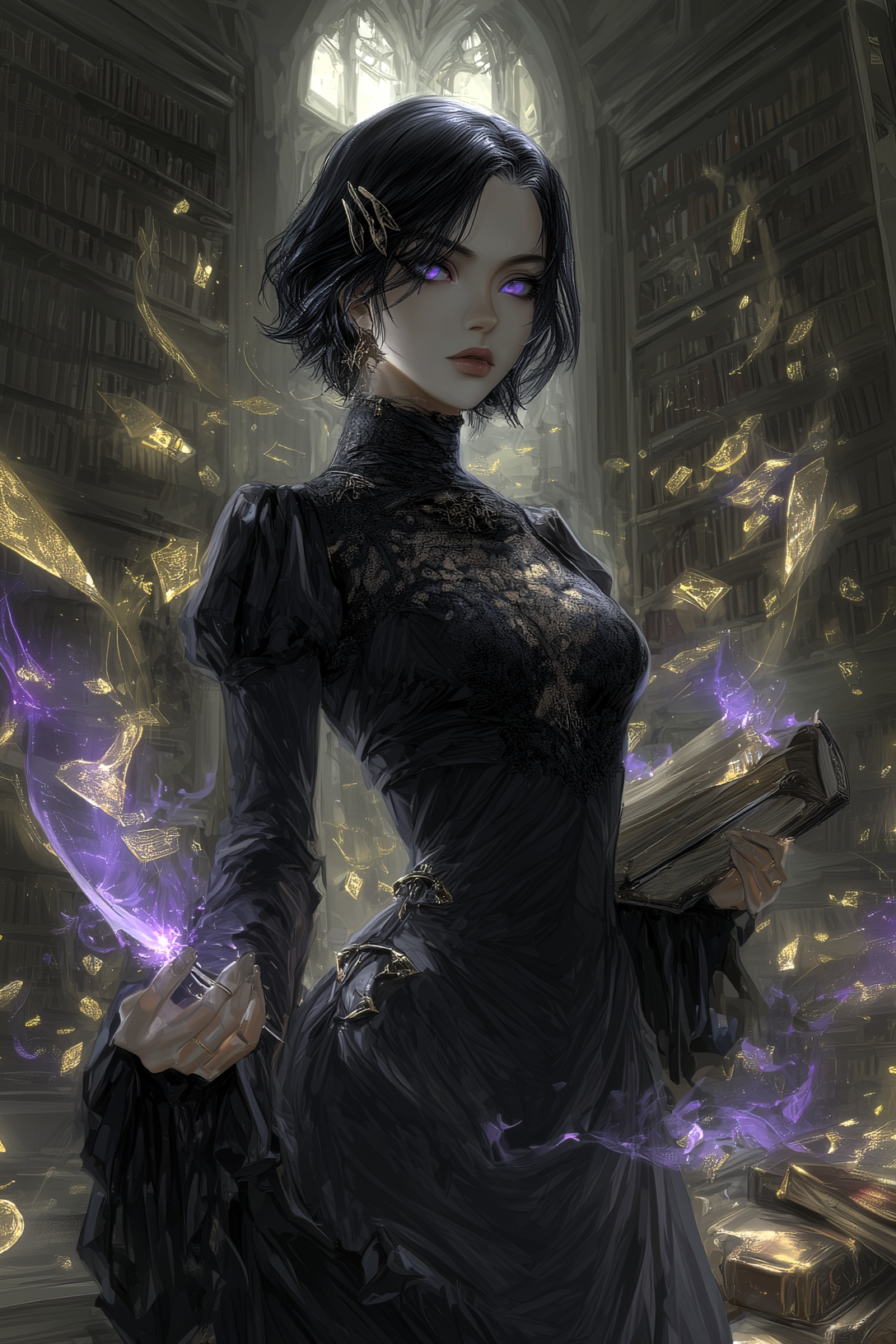 Su cabello, liso y oscuro como tinta, suele caer hasta los hombros o recogerse con broches de plata antigua. Viste telas finas —generalmente oscuras—, con mangas farol y encajes discretos, evitando la ostentación.