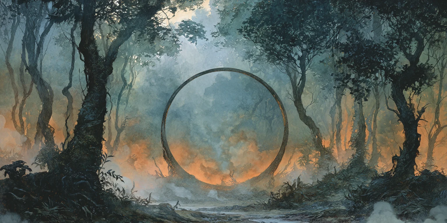 For weeks, your dreams have drawn you here: the same fog, the same ring glowing like dying shimmer of a dawn's lost fire, the same whisper in the silence; calling, waiting. Tonight, you stand before it, breath misting, heart hammering, as the ring looms like a wound in the earth, patient, ancient, and alive.