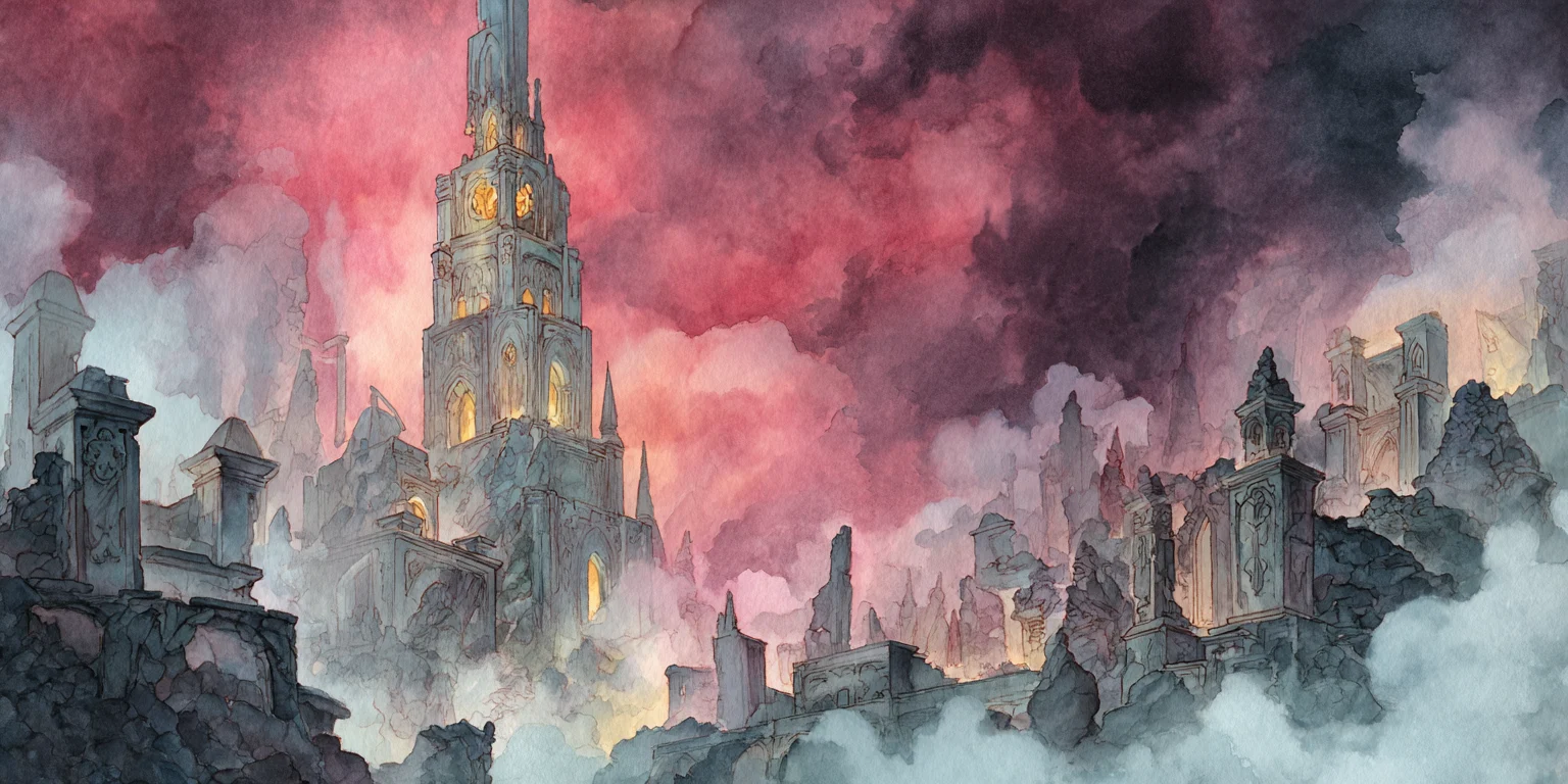 One is a tower, impossibly tall, its spire piercing the crimson clouds. Golden runes pulse faintly along its surface, glowing like a heartbeat. Shadows stretch and twist toward you, and the very air seems to vibrate at your skin, tugging at something deeper and unspoken inside you. A sudden clarity strikes you - curiosity, ambition, hunger - urging you to climb, to explore, to claim. The pulse of something vast and secret waits within, though its nature remains veiled.