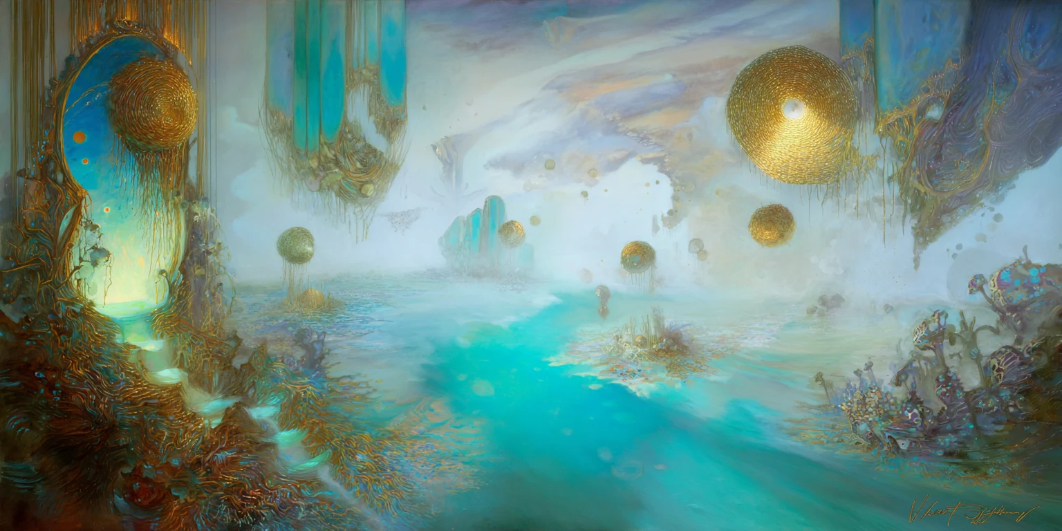 You float in an endless sky of stars. Around you drift countless islands. Some no larger than pebbles, others vast as continents. They hang in the void like fragments of forgotten worlds, each encircled by ribbons of color: silver, gold, rose, and teal. The hues swirl and twist into living currents, luminous pathways that whisper as they move; songs of promise, tunes of longing, poems of memory.