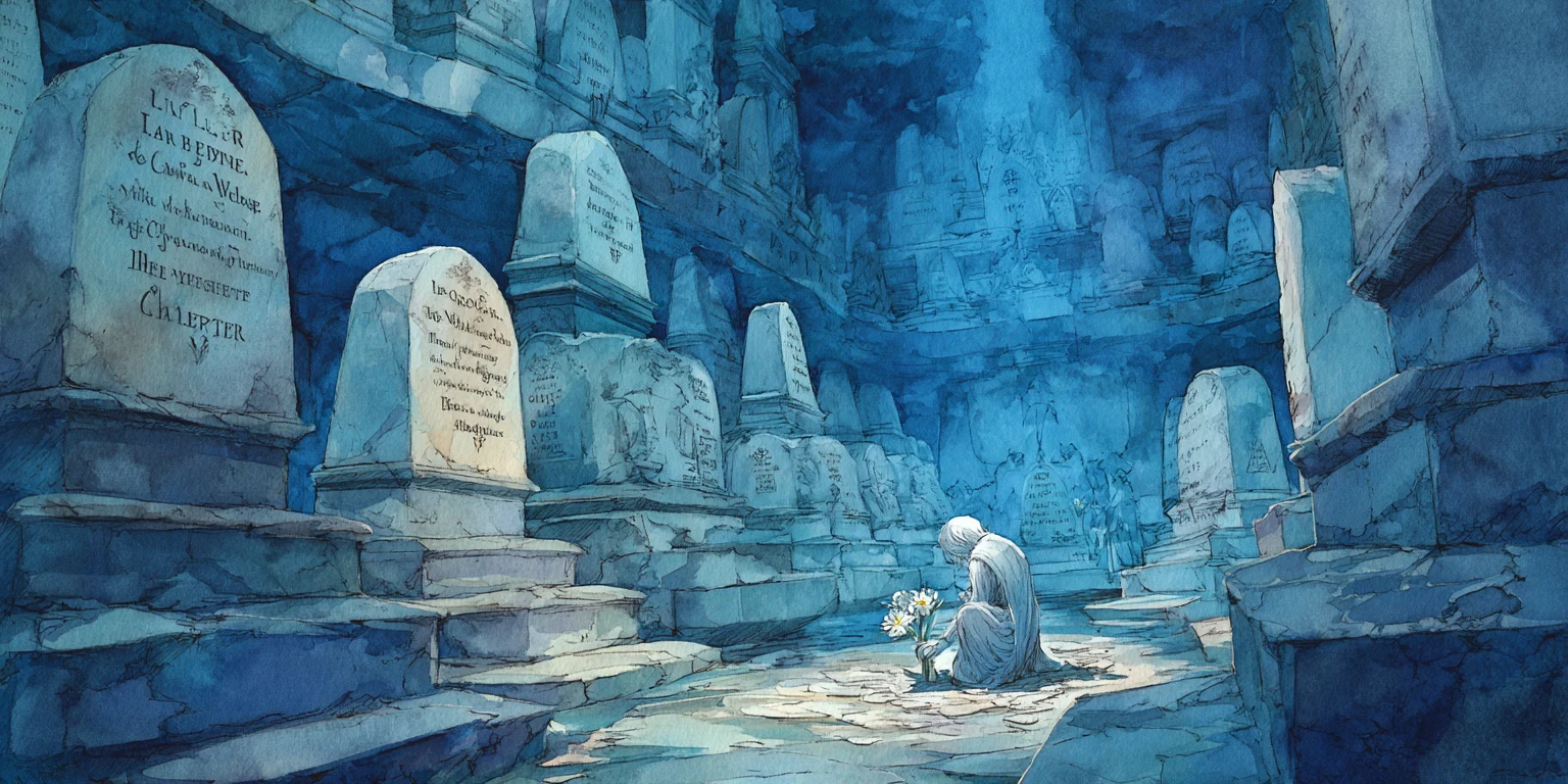 You step forward. The passage widens into a burial chamber. Graves stretch across the walls in perfect symmetry, each marked by a portrait - your portrait - etched into the stone. Some show you younger, some older, some softer, some proud. Beneath each likeness lies a different title in each of them.