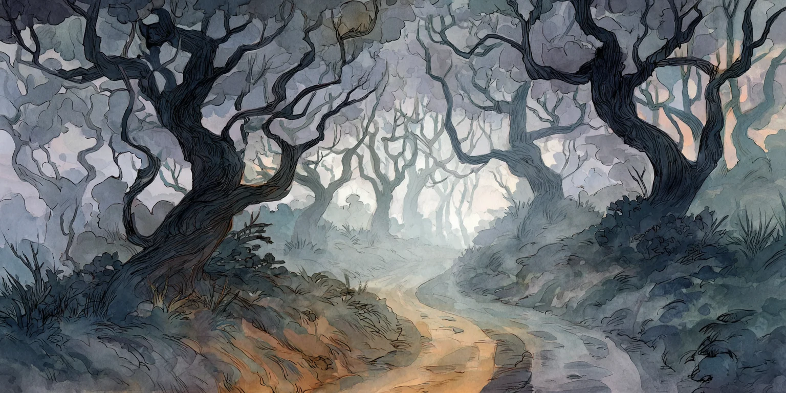 Your breath quickens. Cold sweat runs down your spine. The steady rhythm of your heart is the only thing still anchoring you to the reality you know. The trees stretch taller the farther you walk, their trunks bending unnaturally, their roots curling like veins across the soil. The fog clings close, hiding the trail until you are certain there is none left at all. Then, out of nowhere, a fork opens before you.