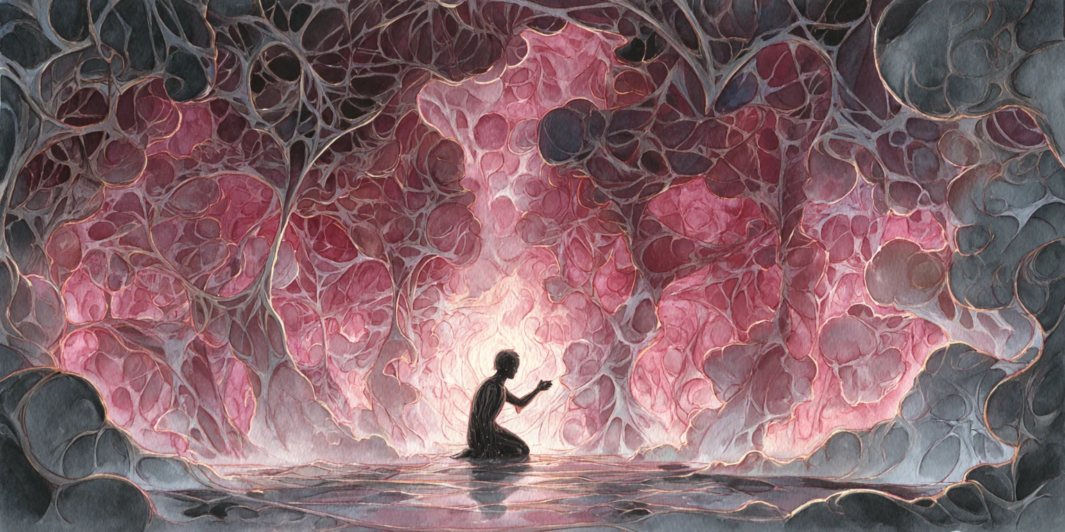 The walls pulse faintly, slick with translucent veins that crawl like rivers of light beneath thin skin. The air is metallic and sour. Each breath scrapes your throat raw, as if you are inhaling through someone else’s wound.