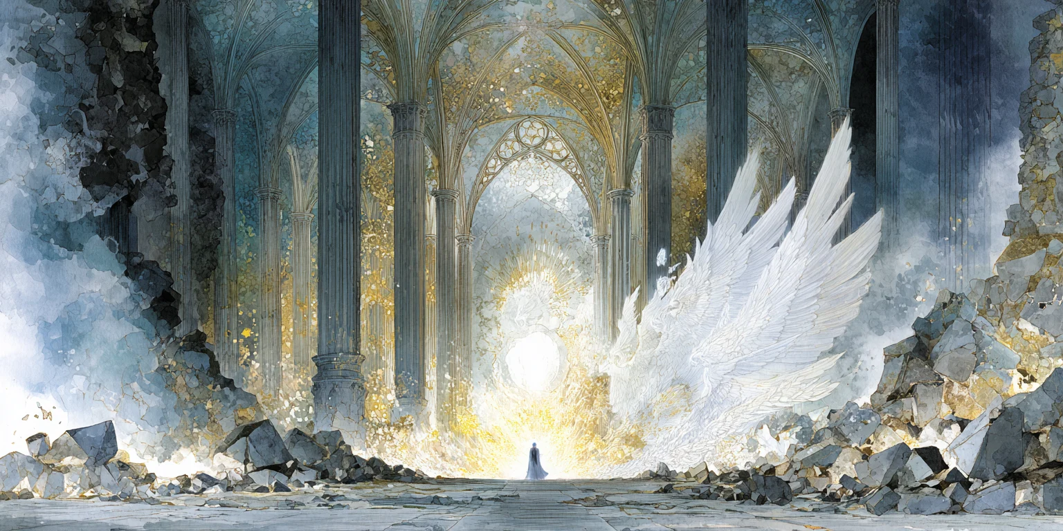 The cathedral trembles and they leap. Their flight carves a wake of falling light, streaking through the broken roof above.
