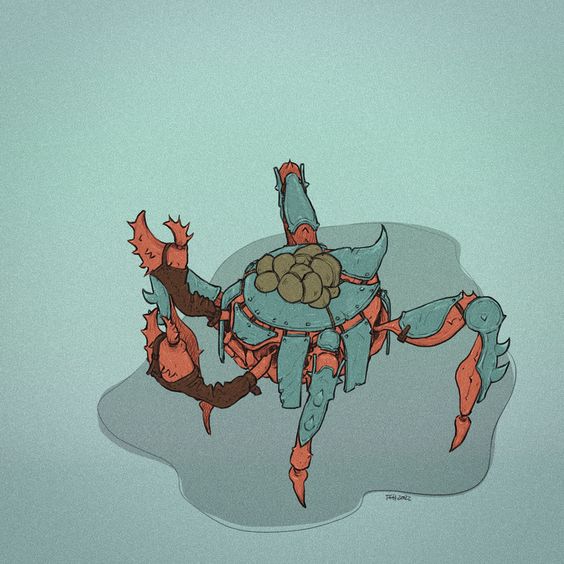 The Land Crabs are massive, slow-moving crustaceans that roam the coasts and wetlands, their heavy shells streaked with mud and rust-colored grime. Despite their lumbering pace, they are immensely strong, able to crush bone or metal alike with their jagged pincers. Most dwell near the water’s edge, scavenging carrion and algae, but some wander far inland in search of food, dragging their armored bulk across the sand.