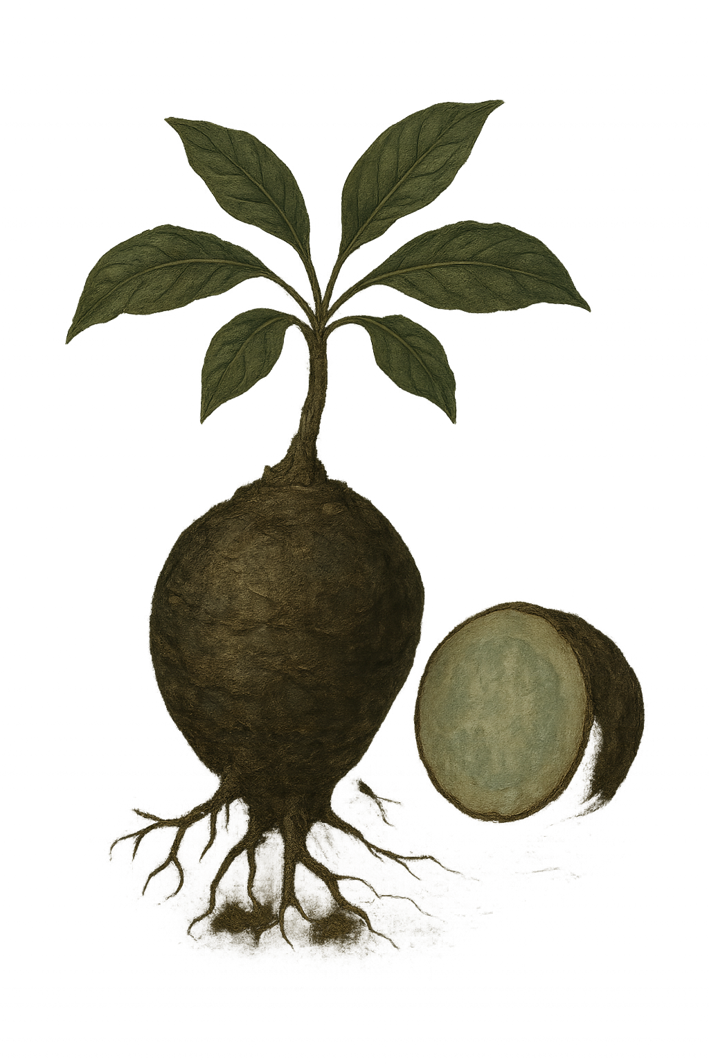 A swollen, starchy root that grows beneath the mud, with black skin and pale blue flesh inside. Highly nutritious but foul-smelling when cooked.