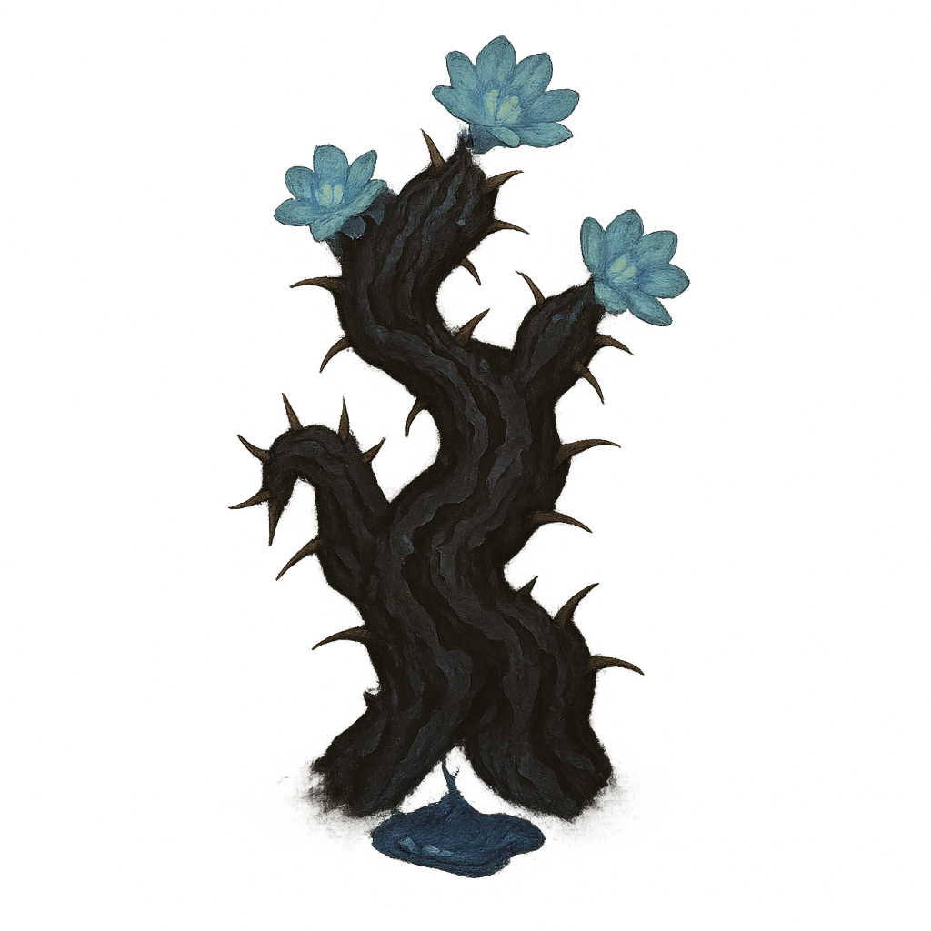 A small, twisted cactus with skin that looks charred black, seeping a tar like substance called Moonsap. At night, its flowers emit a faint phosphorescent glow.