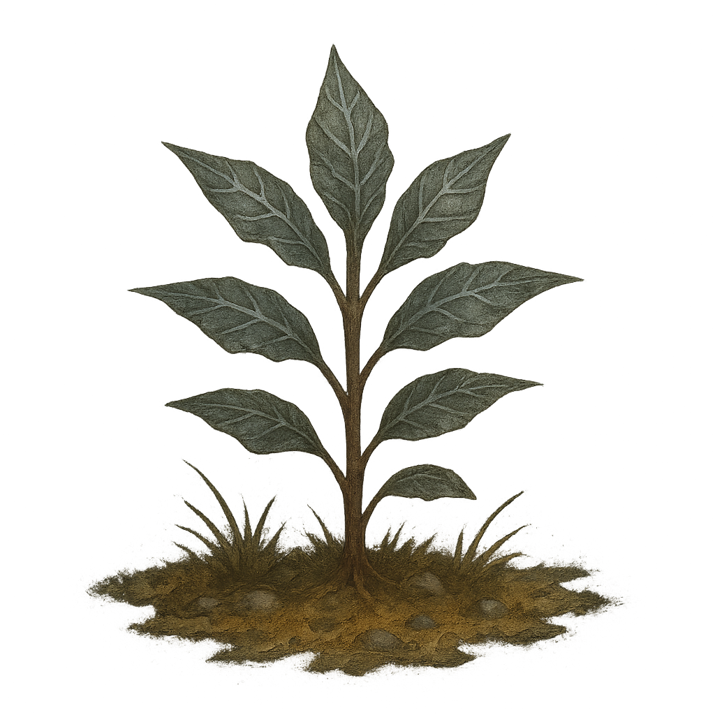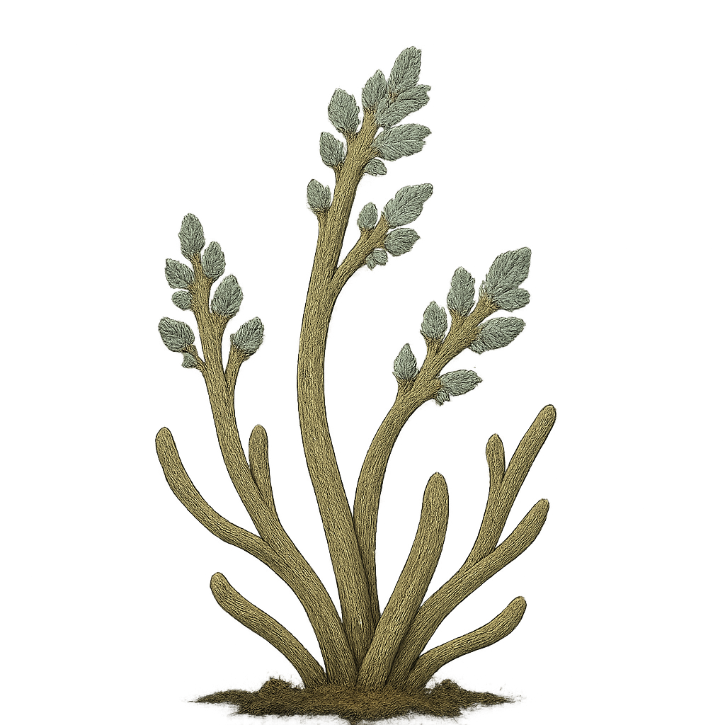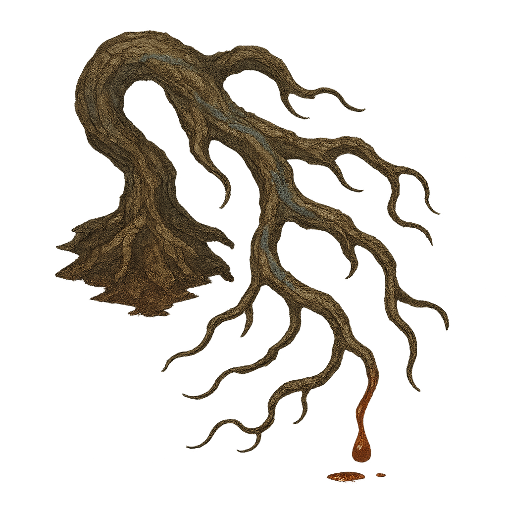 A gnarled rootline that grows from soil rich with rust. Its fibers are laced with iron, and when cut, it bleeds a metallic sap that quickly oxidizes.