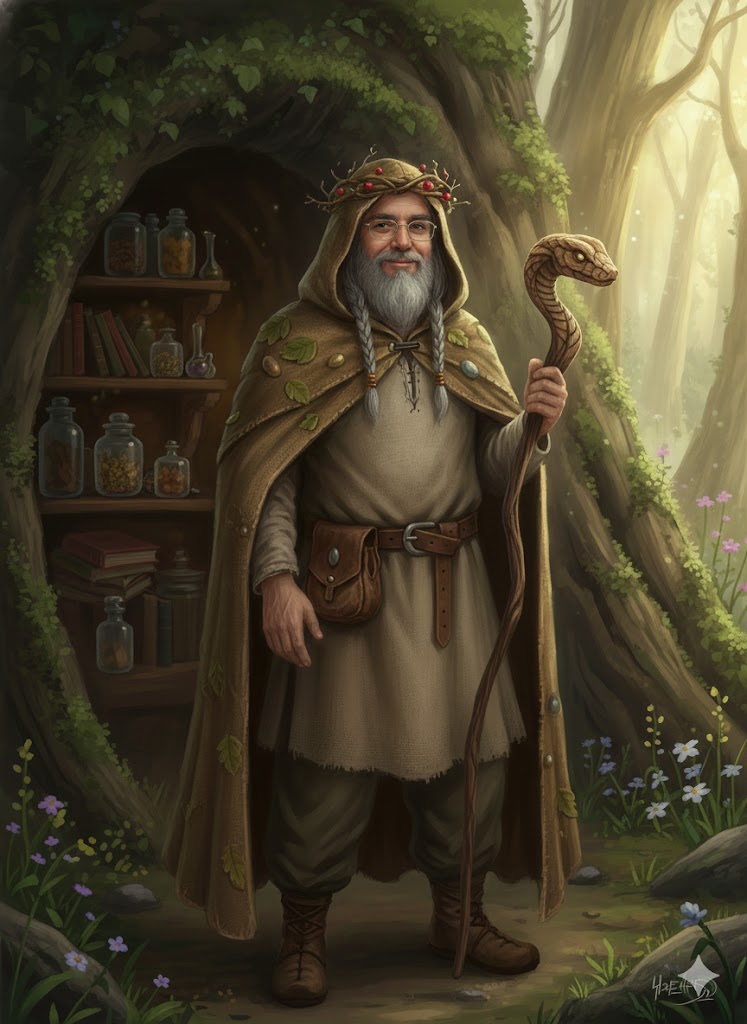 Arthom Snakestick is a sage and illusionist, hailing from Uktaria, who travels the vicinity of Red Rock Lake and the woods of the Kingdom of Laeryll, musing about long-lost civilisations and alchemy. He spends his life in a solitary fashion, seeking wisdom through experience while accompanied only by his pet lizard. A kind-hearted individual, he is generous with his services and eager to share a meal.