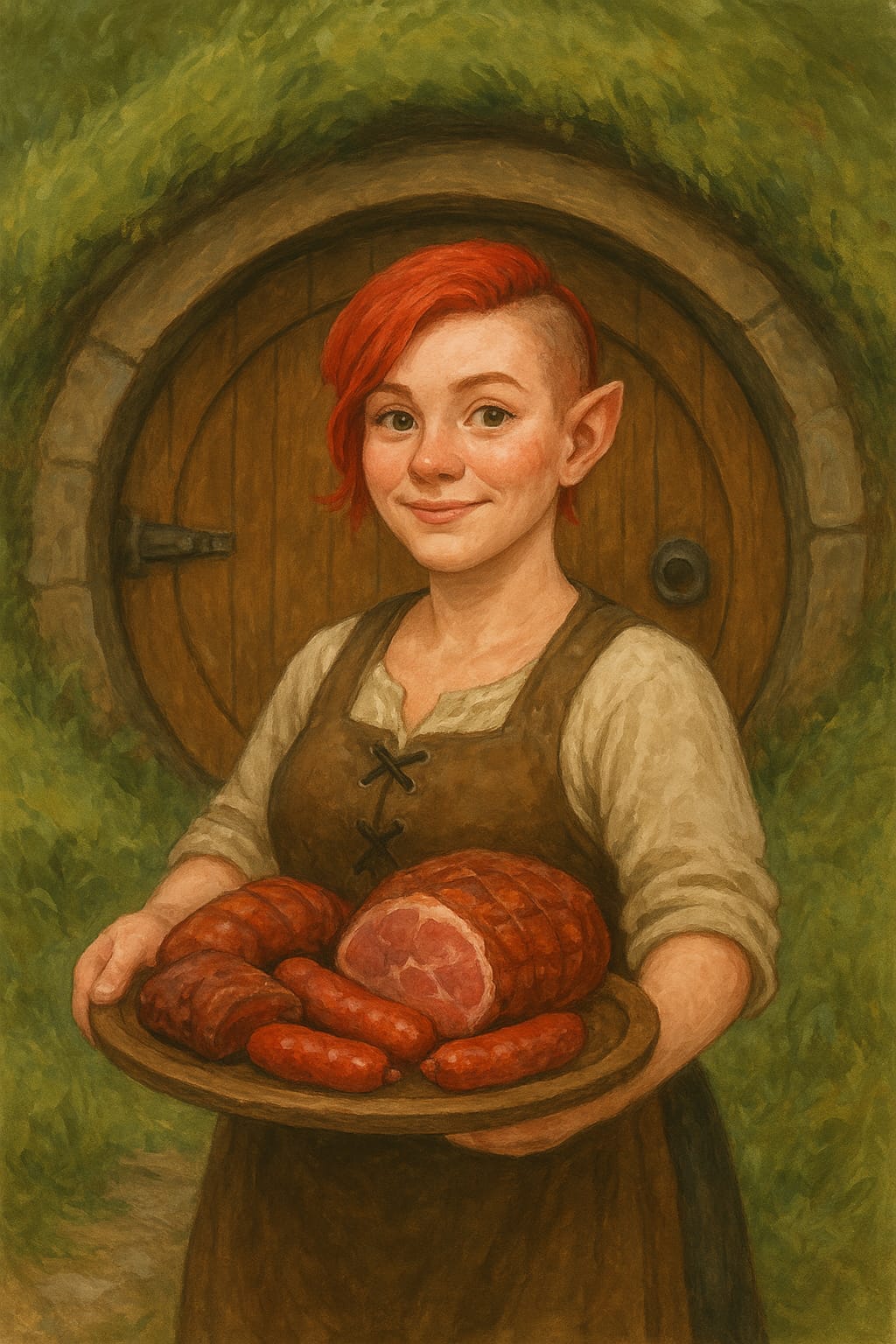 Bestides the hill there is a wooden deck overlooking the river and a small peer down the slope on the riverfront. the food is being prepared in the kitchen withing the hobit holl, by orvil and is usually delivered by Tyra to the deck where tables are situated.