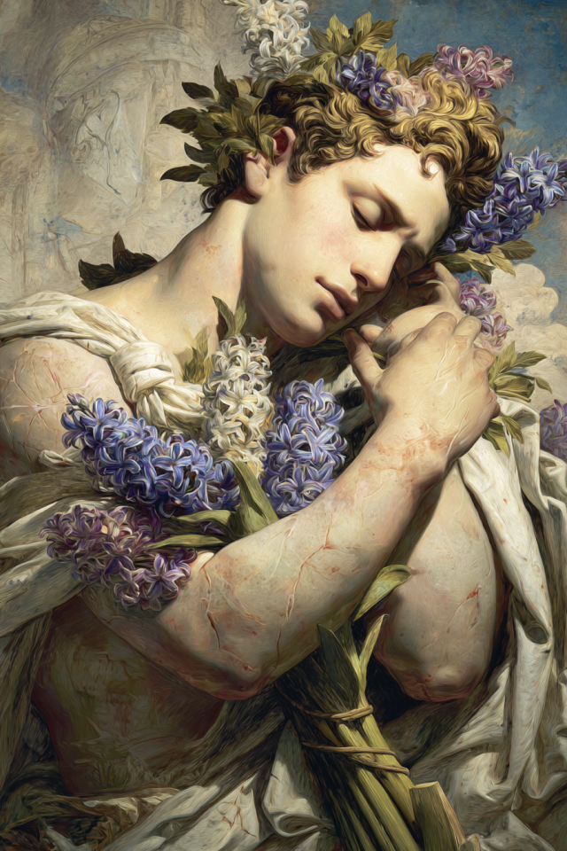 Thus Hyacinthus was not wholly lost. His name lives in the flower, and in the tales sung by poets who speak of the god’s love for a mortal boy. In the story of Apollo and Hyacinthus, the Greeks saw both the fragility of beauty and the endurance of devotion — a love that even death could not erase.