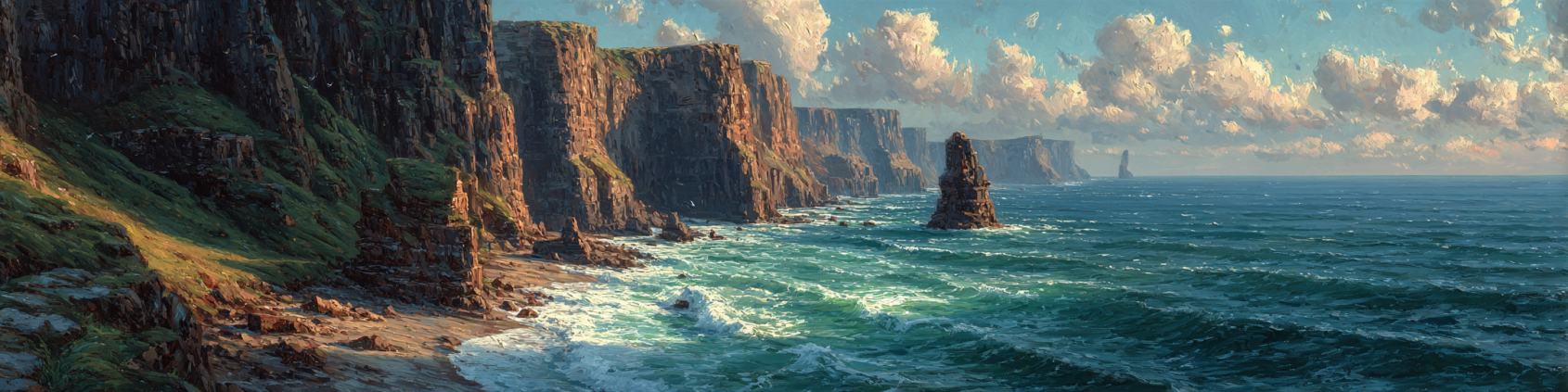 Where the green fields of western Éire end, the land does not taper gently; it stops. The Cliffs of Moher fall sheer into the great water, an eight-kilometer wall of shale and wind that hums like a great instrument. Sea birds circle in endless spirals, white against the dark rock, their cries blending with the surf below.