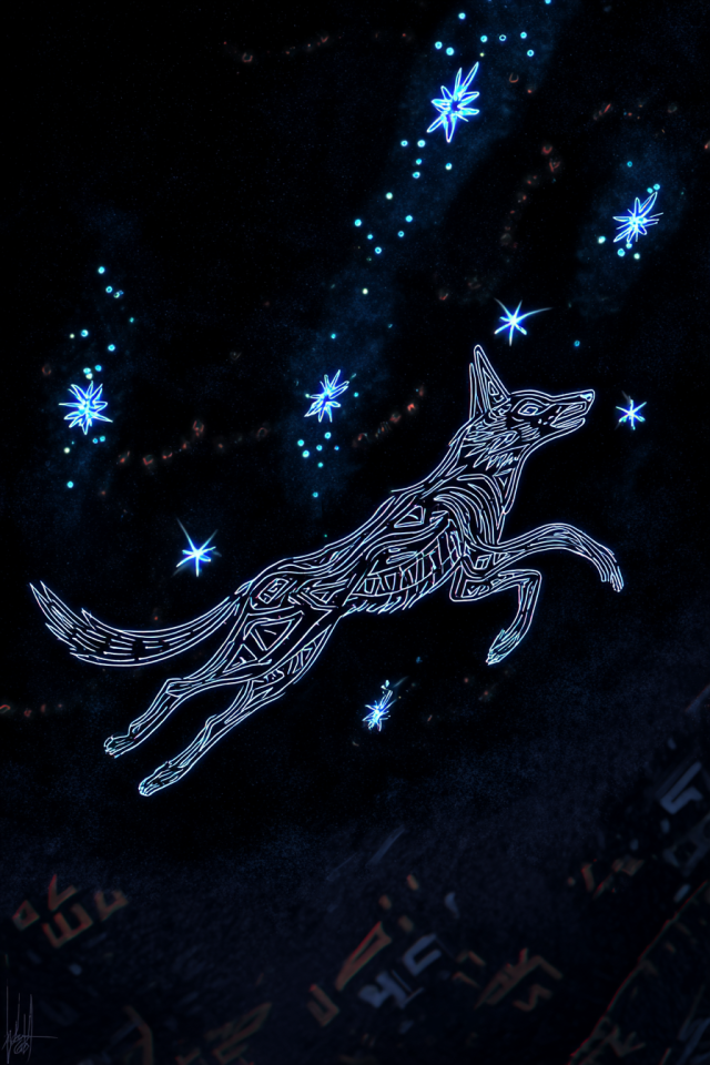 Trickster Coyote scatters the stars across the night sky, bringing both beauty and chaos.