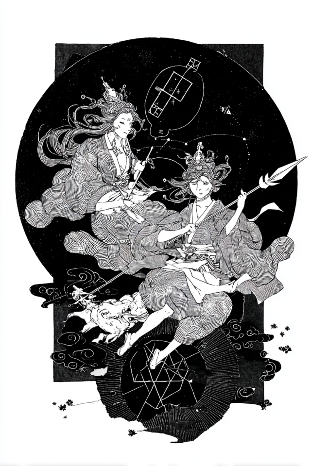 In the time before memory, when the earth was still forming and the heavens swayed, there were two siblings born of the chaos: Fuxi and Nüwa. Their bodies were human above but serpent below, for they belonged both to earth and to the primal forces beyond it. They roamed the empty world together, gazing upon rivers, mountains, and skies, and wondered what shape the future would take.