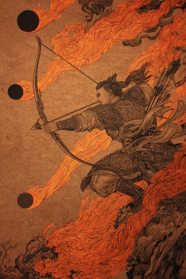 So Yao called Houyi, the archer of unmatched skill. Houyi took his bow of mulberry wood, his arrows tipped with white feathers, and set forth. He climbed Kunlun, the great mountain at the world’s spine, and from its heights he beheld the blazing suns.